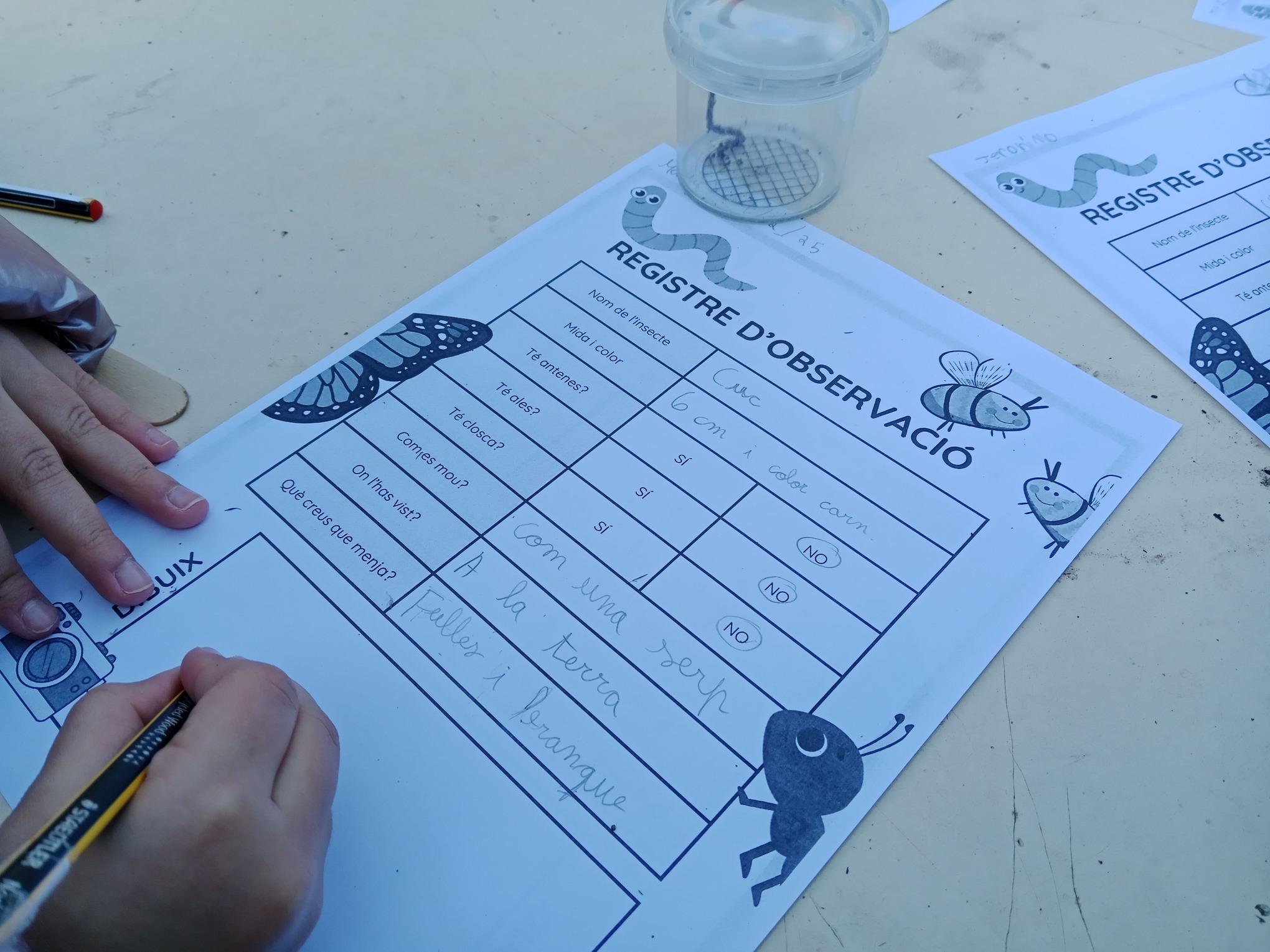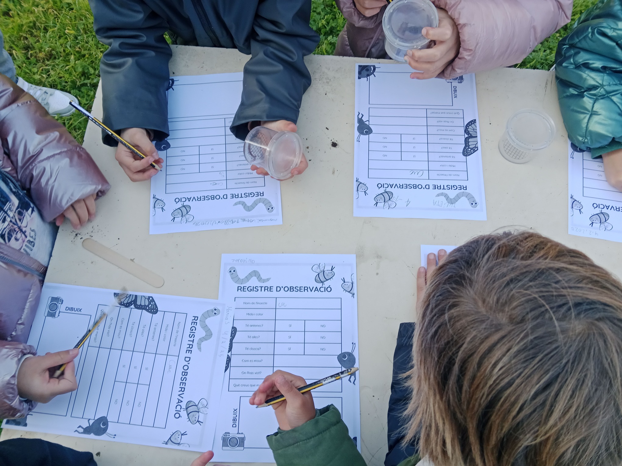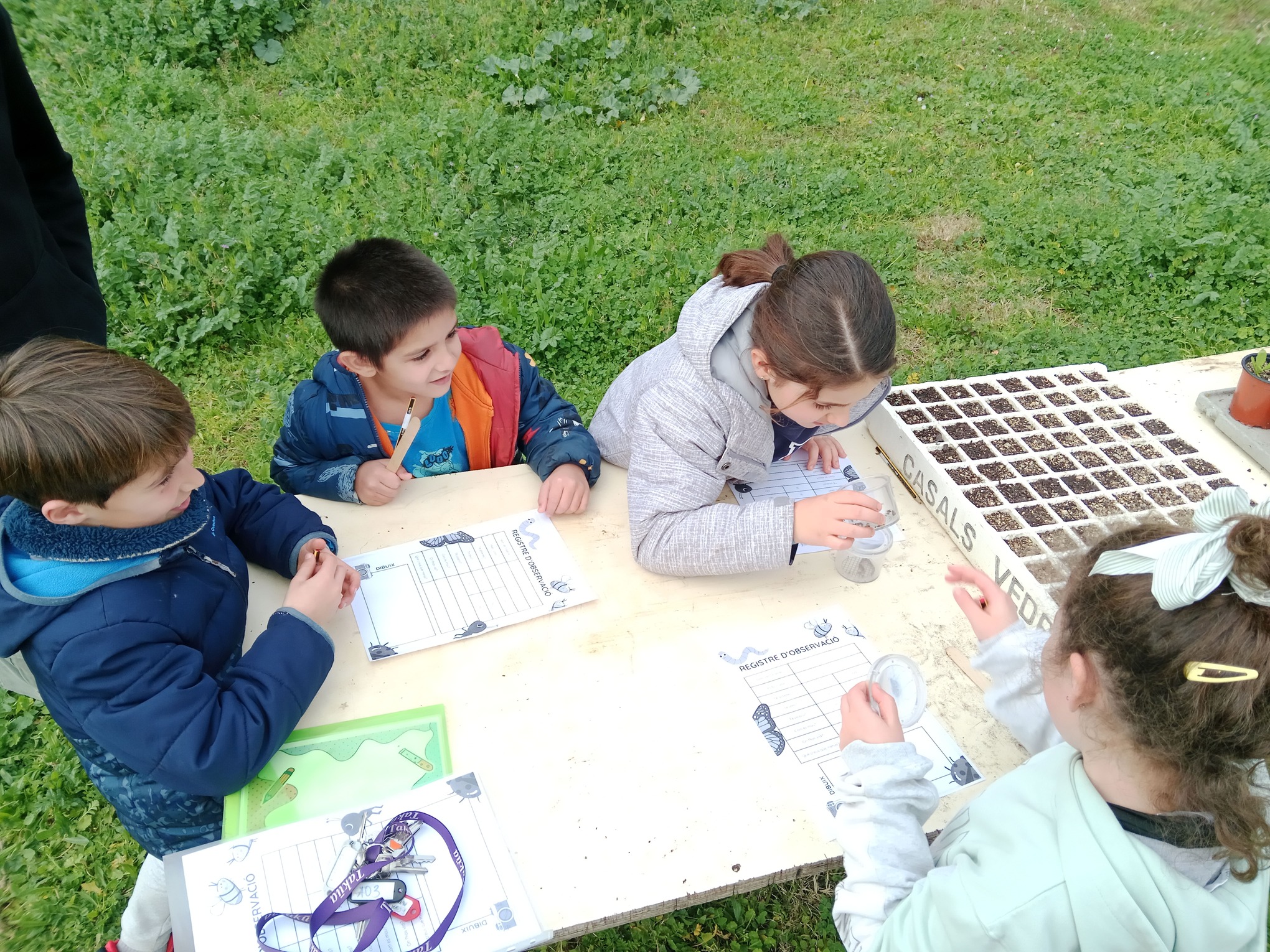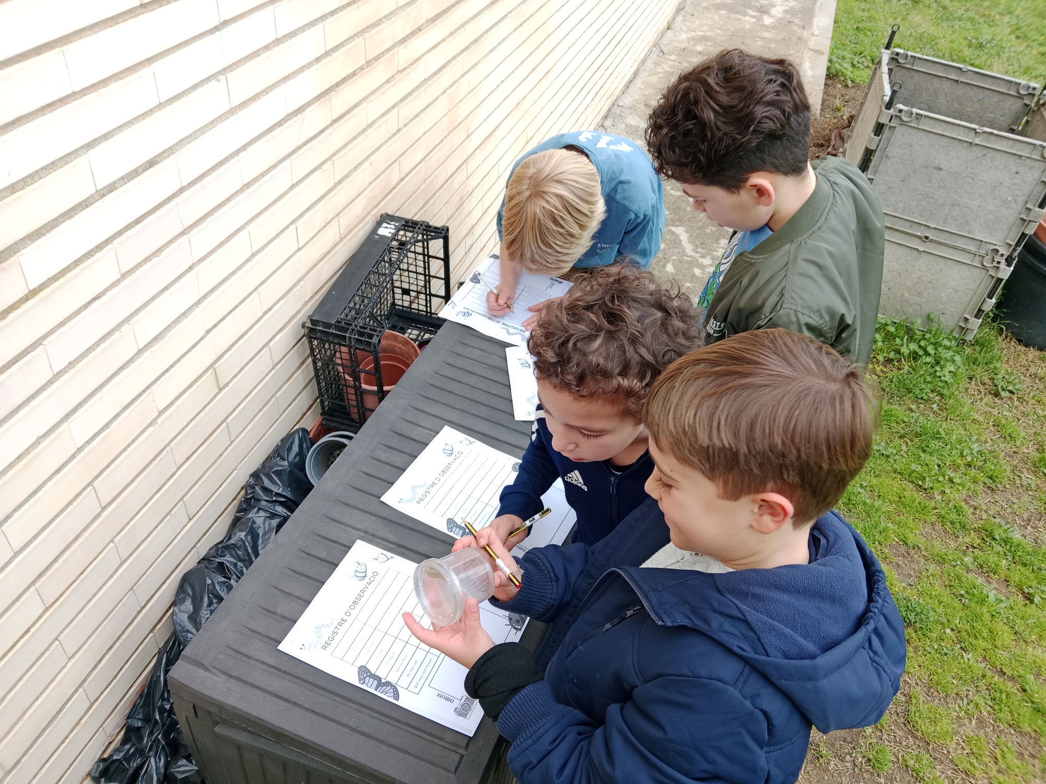 Els nens i nenes han estat explorant els racons més sorprenents de l’hort, observant, capturant i identificant els diferents insectes que hi troben. Han après a fer servir pots amb lupes d’ampliació per analitzar les seves característiques i, després, han omplert una fitxa de registre per anotar les seves observacions. Aquesta activitat els permet entendre millor la biodiversitat de l’entorn natural, alhora que desenvolupen habilitats científiques en el procés.