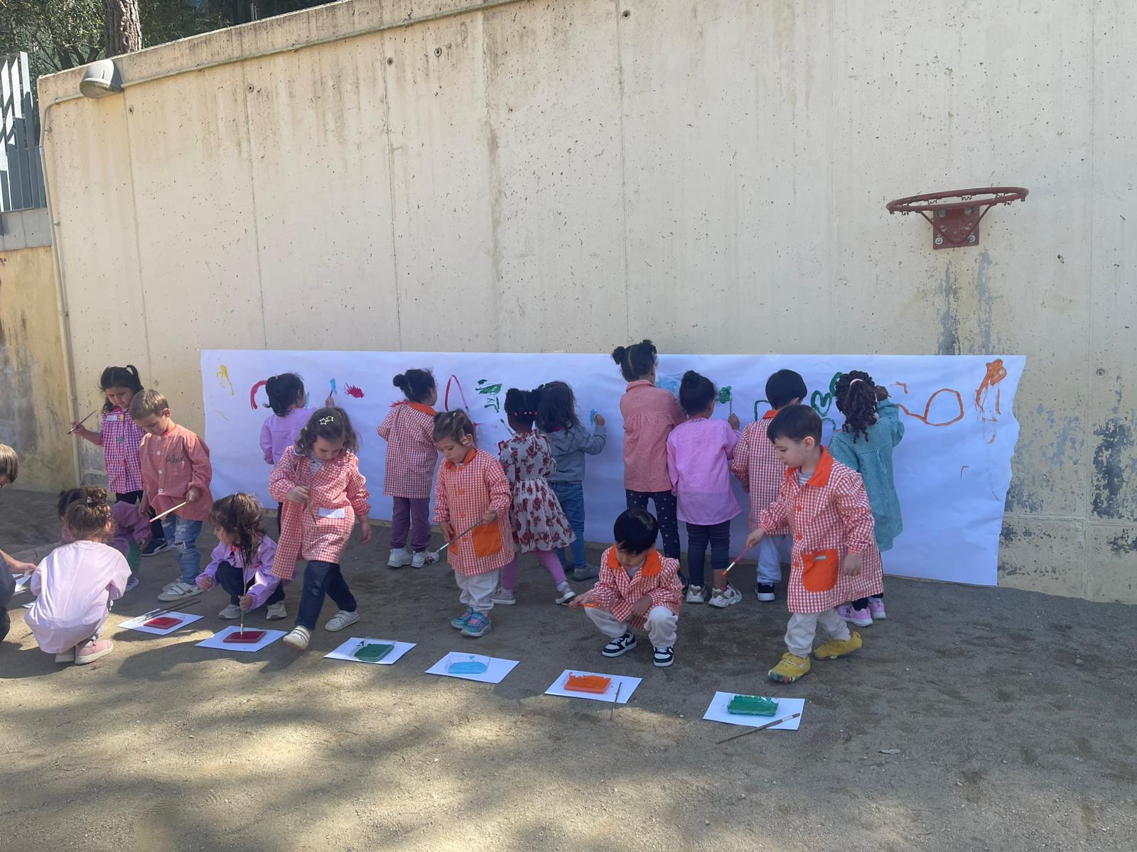 Les nenes i els nens de la classe del mar han aprofitat el bon temps per sortir al pati a experimentar amb pintura.