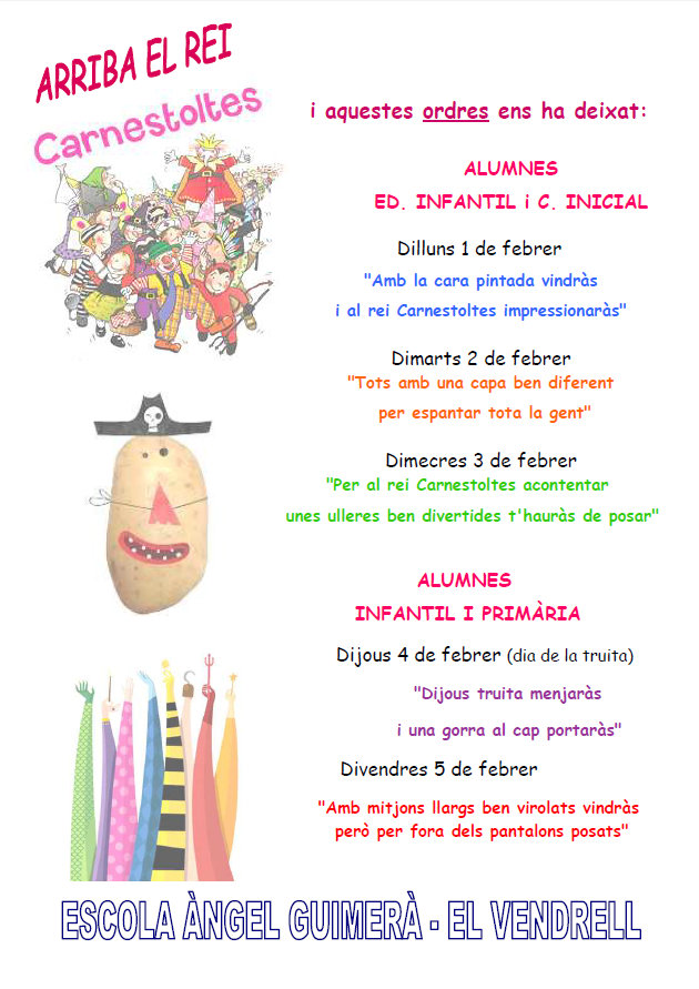 Sa Majestat el Rei Carnestoltes ha arribat a l’escola i ens ha ofert el seu pregó. No ha tingut pietat de ningú. També ens ha portat les seves ordres per a complir durant aquesta setmana de gresca i xerinola. Aquí teniu l’enllaç per veure el vídeo del divendres de carnaval. http://www.rtvelvendrell.cat/carnaval-2016-escola-angel-guimera/ Aquí teniu l’enllaç per