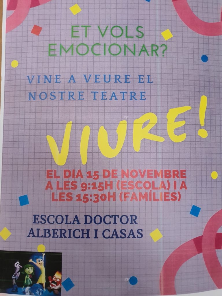 Els nens i nenes de 3r han representat l’obra de teatre “Viure!”, basada en la pel·lícula “Del Revés” (2015) on s’explica la història de Ridley, una nena d’onze anys que canvia de ciutat, d’escola, d’amics… Intenta habituar-se a aquesta nova vida, guiada per les seves emocions: l’Alegria, la Por, la Ira, el Fàstic i la