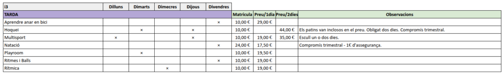 - MULTIESPORT 2 DIES (dilluns i dijous) → Us heu d’apuntar a aquesta última si voleu l’opció de dos dies.