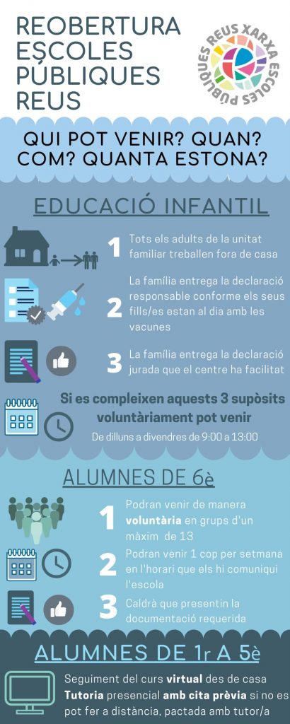 PLA D’OBERTURA DE CENTRES EDUCATIUS EN FASE 2 DE DESESCALADA EN LA FINALITZACIÓ DEL CURS 2019-2020 Feu un comentari / Per admin / 29 de maig de 2020 / L'escola Actualització! En aquest enllaç teniu el document de Pla d’obertura juny Esc. Doctor Alberich i Casas