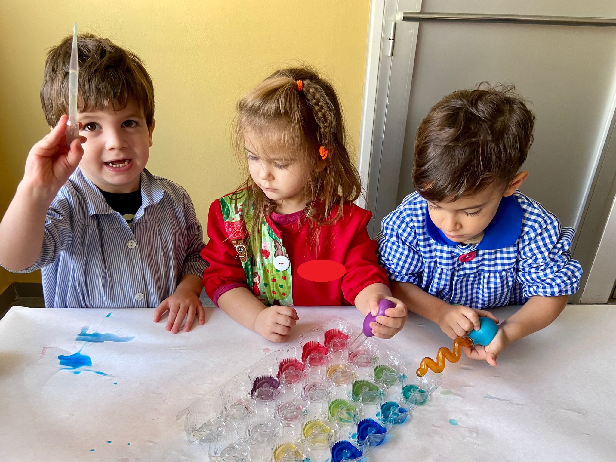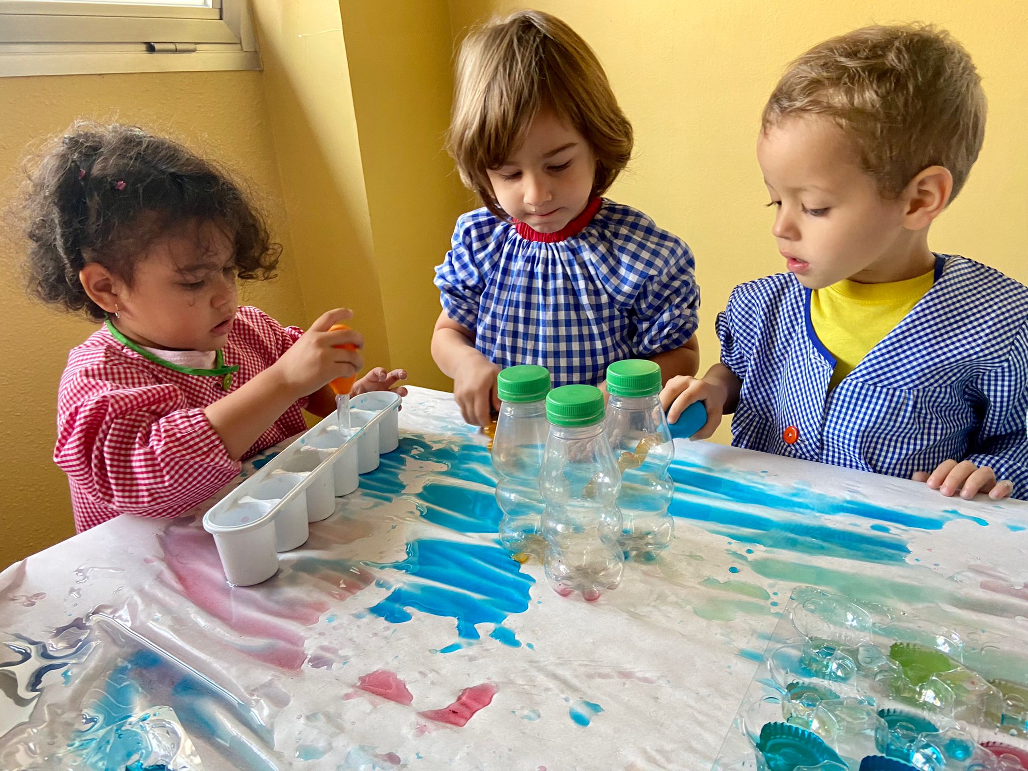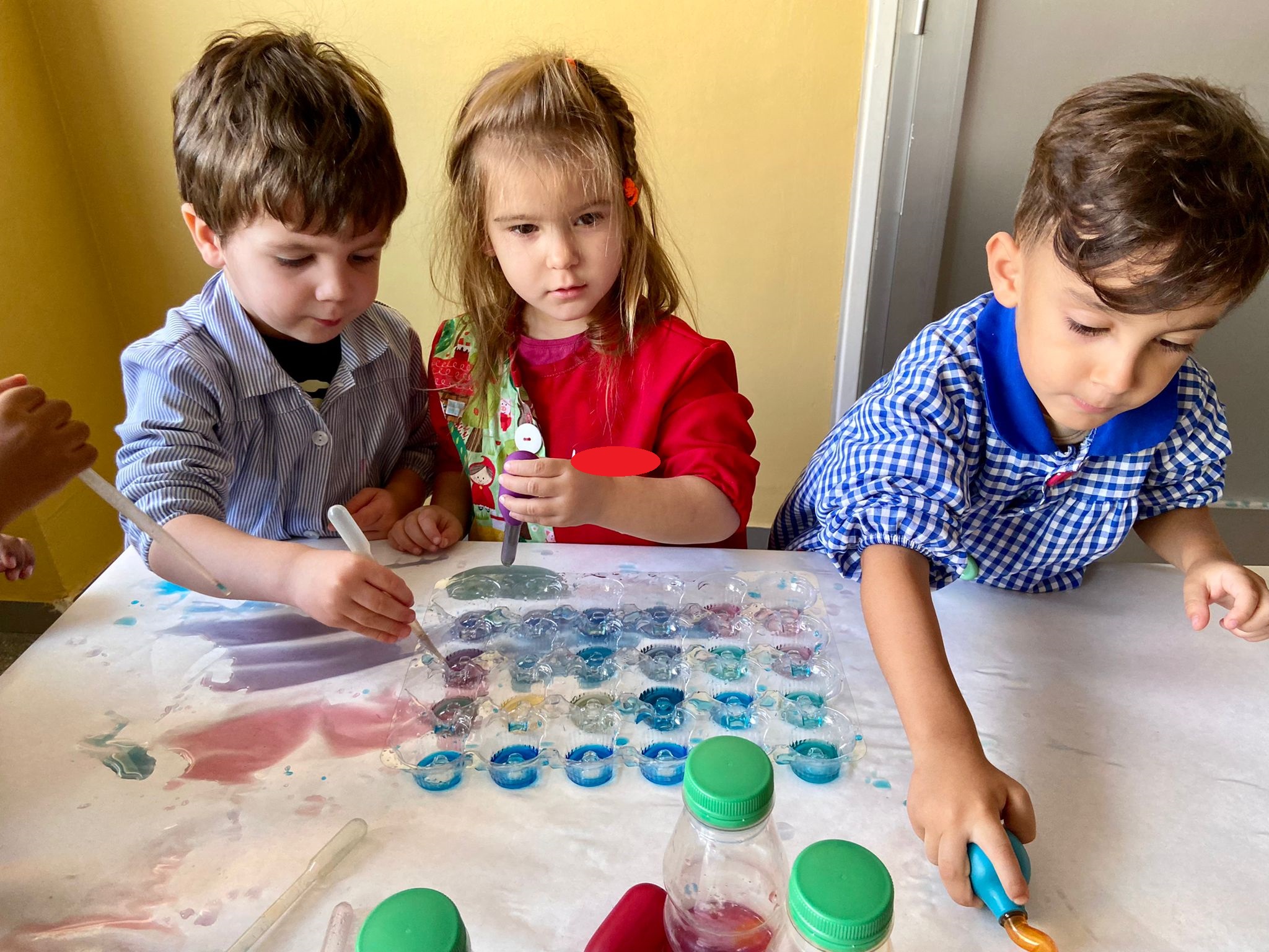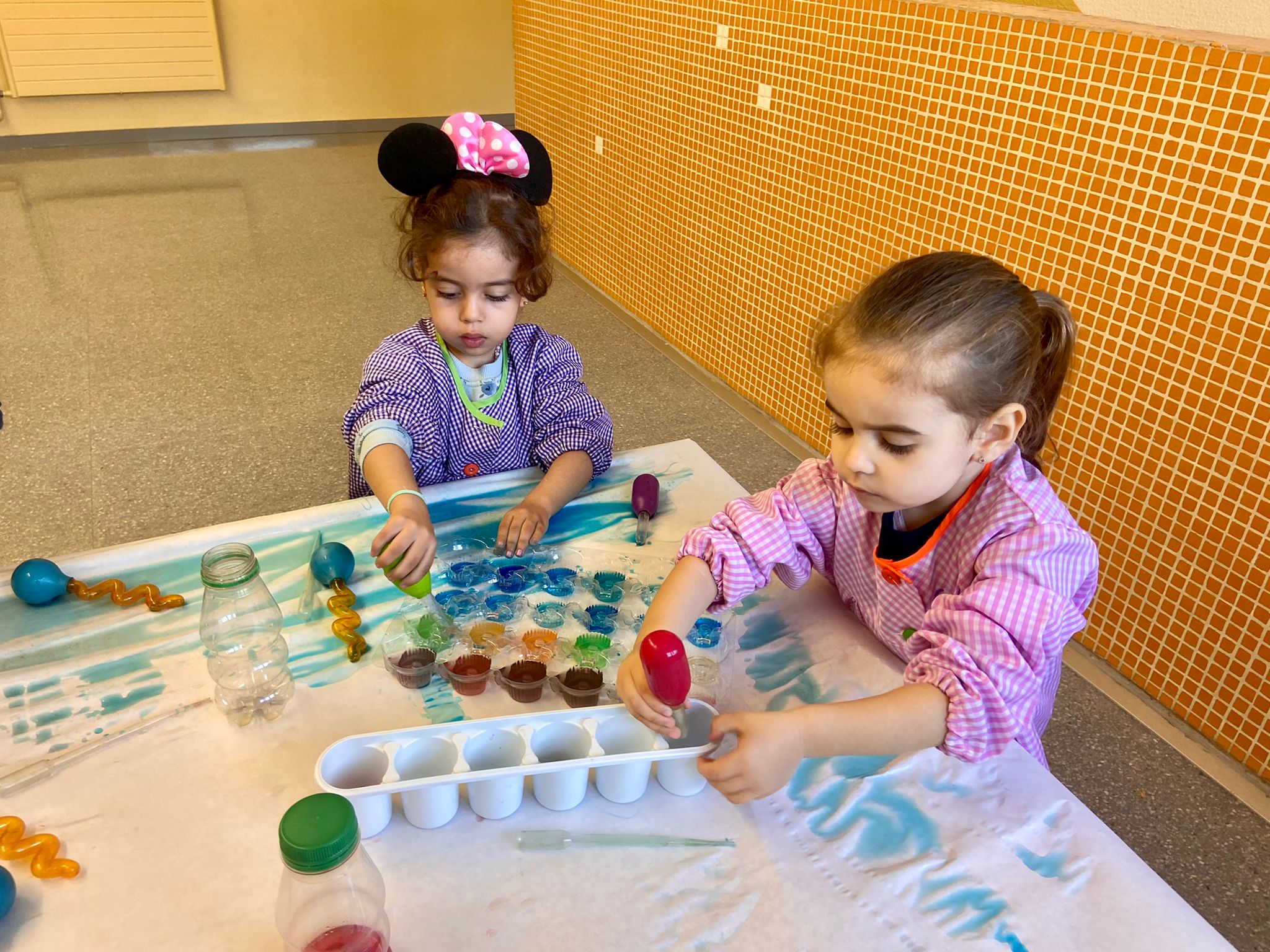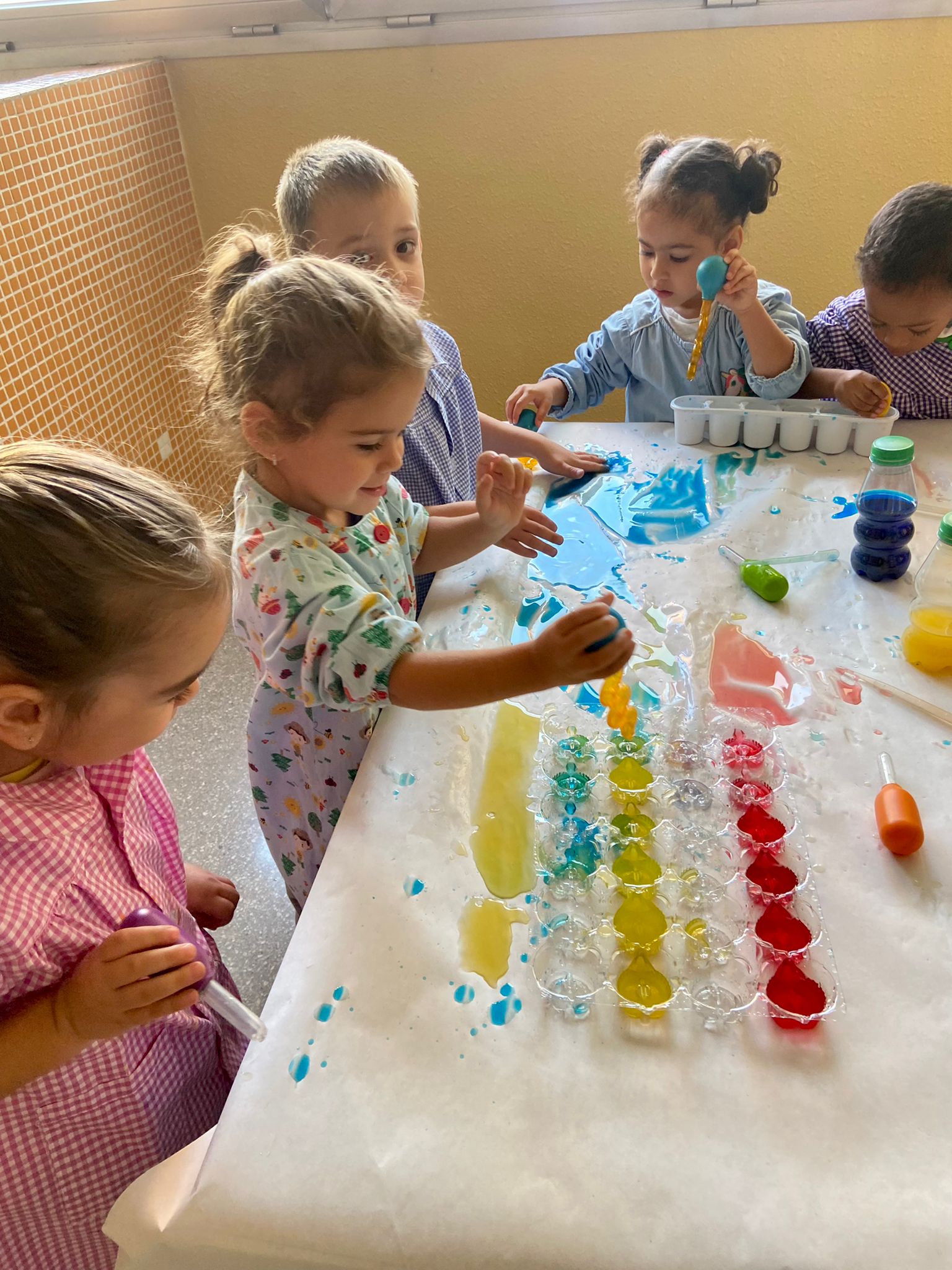La setmana passada vam experimentar amb aigua i colorant els colors vermell, blau i groc. Vam descobrir que amb la barreja de vermell i blau sorgia el color lila, amb la barreja de vermell i groc apareixia el color taronja i amb la barreja de color blau i groc es creava el color verd. També vam descobrir que el fet de posar més o menys quantitat d’aigua variava la tonalitat d’aquesta. Ens va agradar molt fer aquesta experiència!