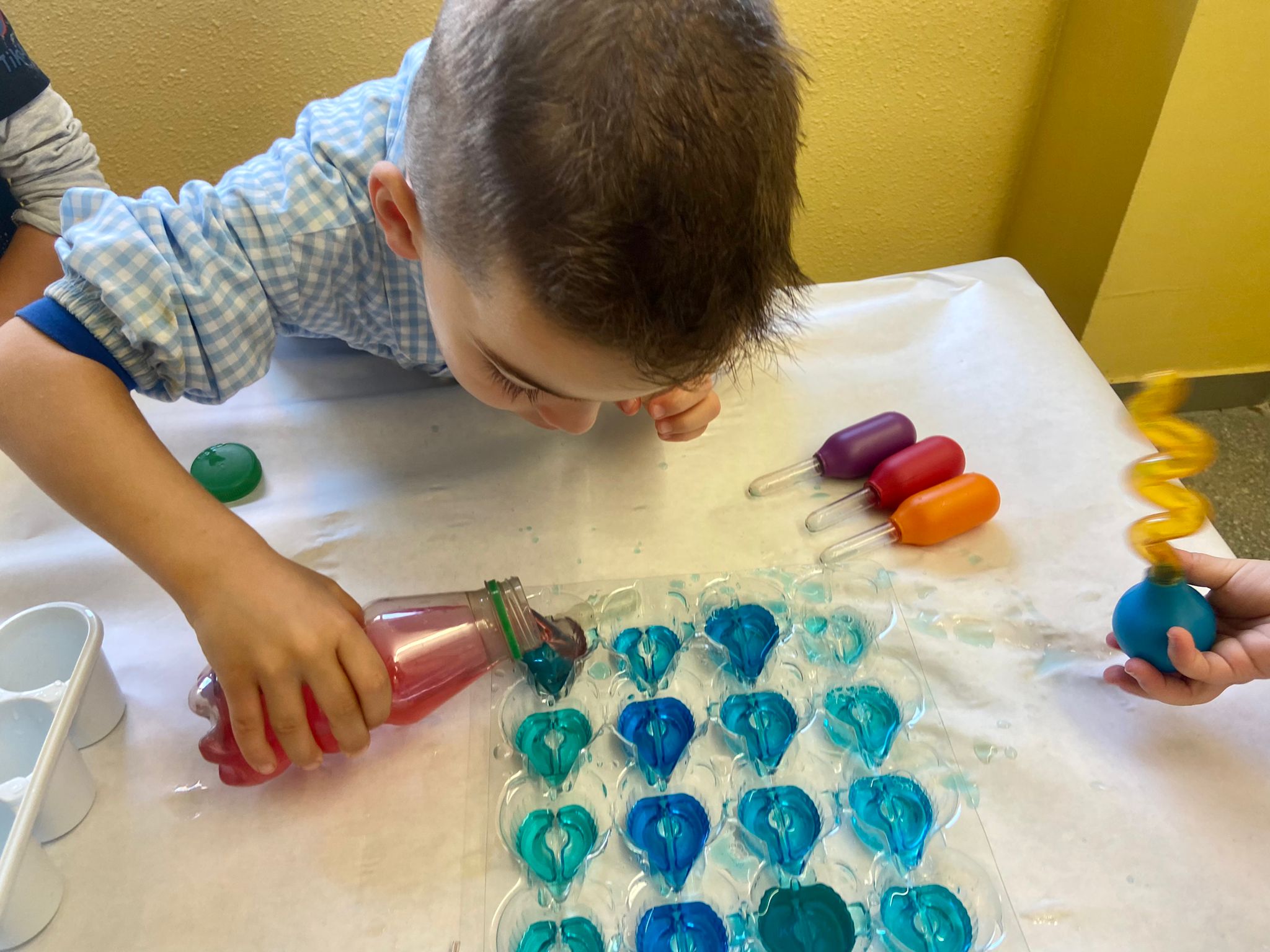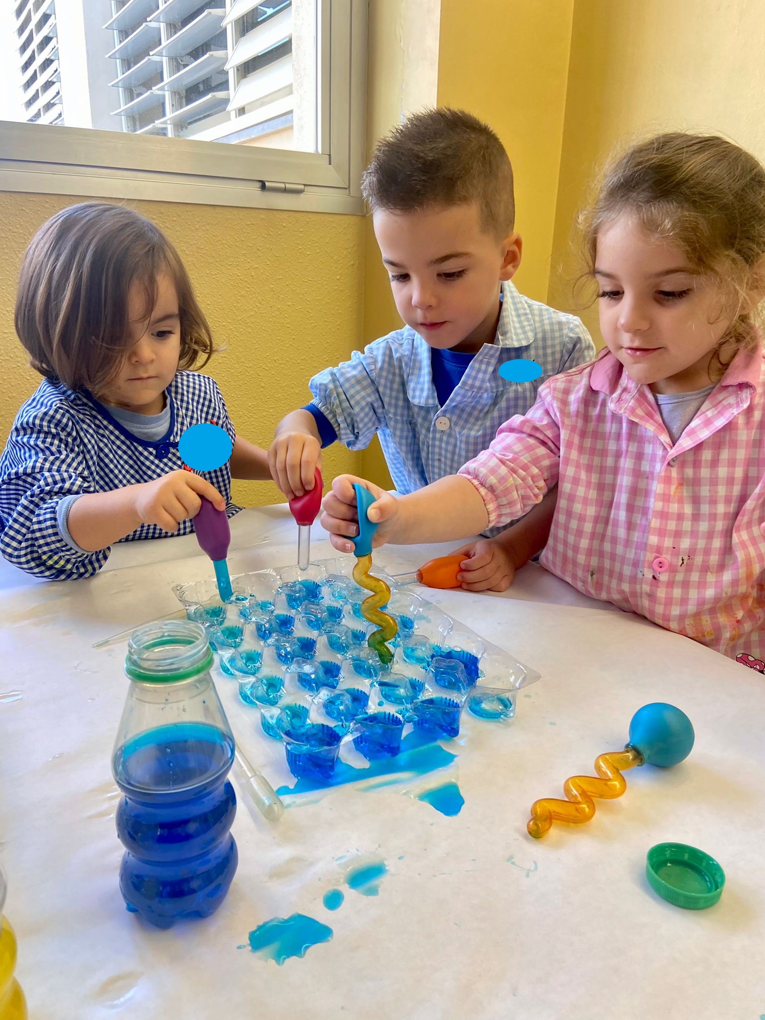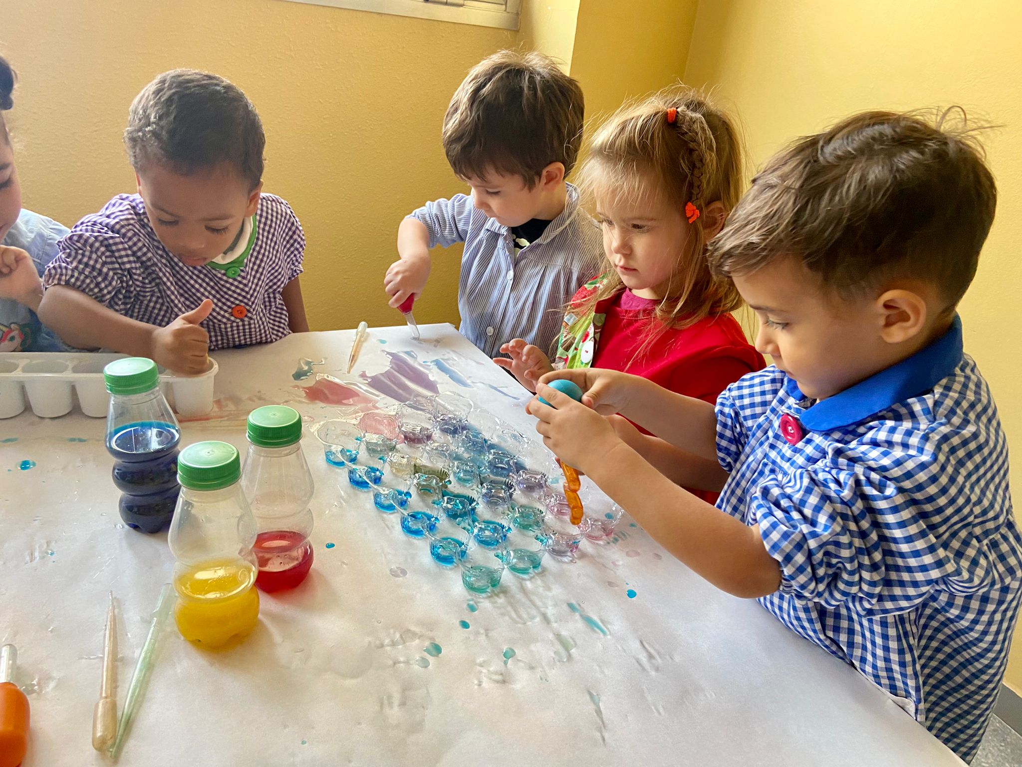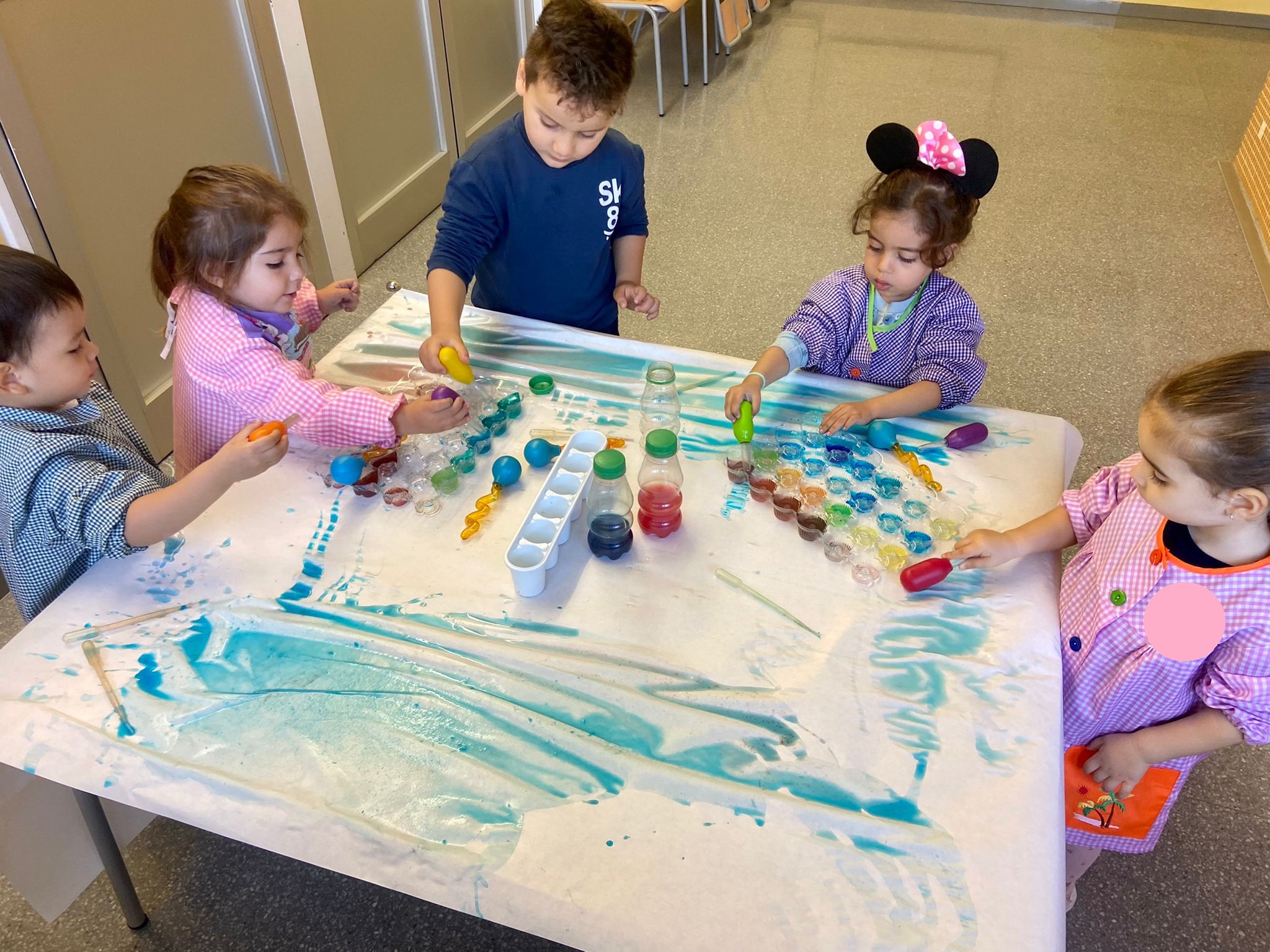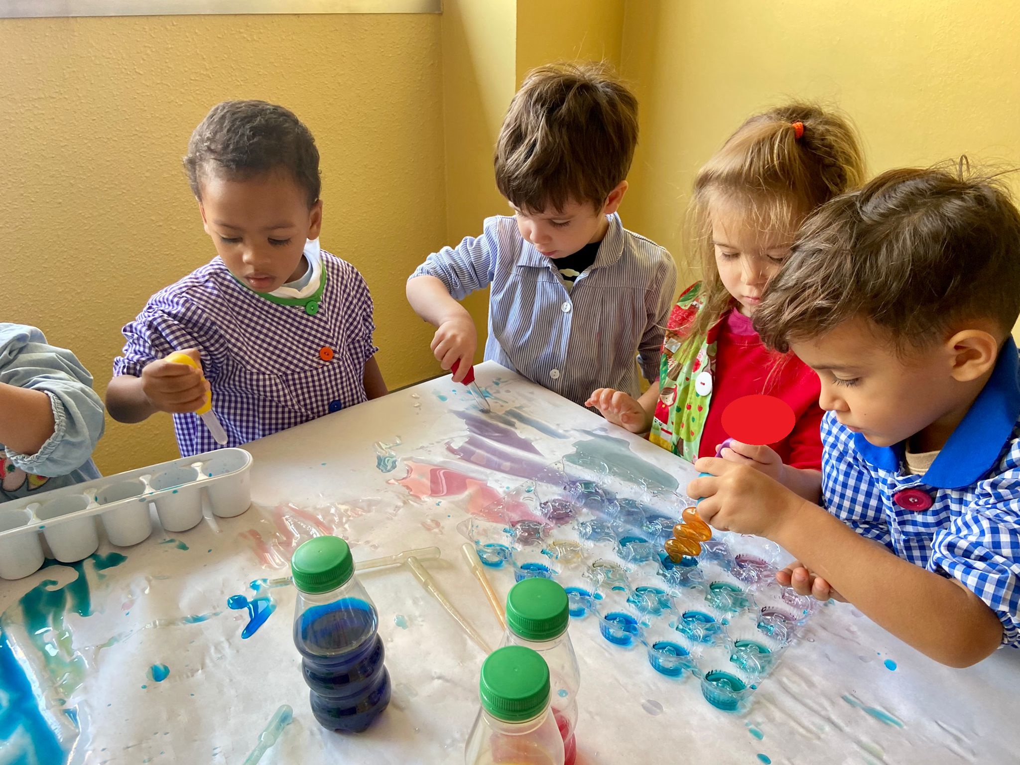 La setmana passada vam experimentar amb aigua i colorant els colors vermell, blau i groc. Vam descobrir que amb la barreja de vermell i blau sorgia el color lila, amb la barreja de vermell i groc apareixia el color taronja i amb la barreja de color blau i groc es creava el color verd. També vam descobrir que el fet de posar més o menys quantitat d’aigua variava la tonalitat d’aquesta. Ens va agradar molt fer aquesta experiència!
