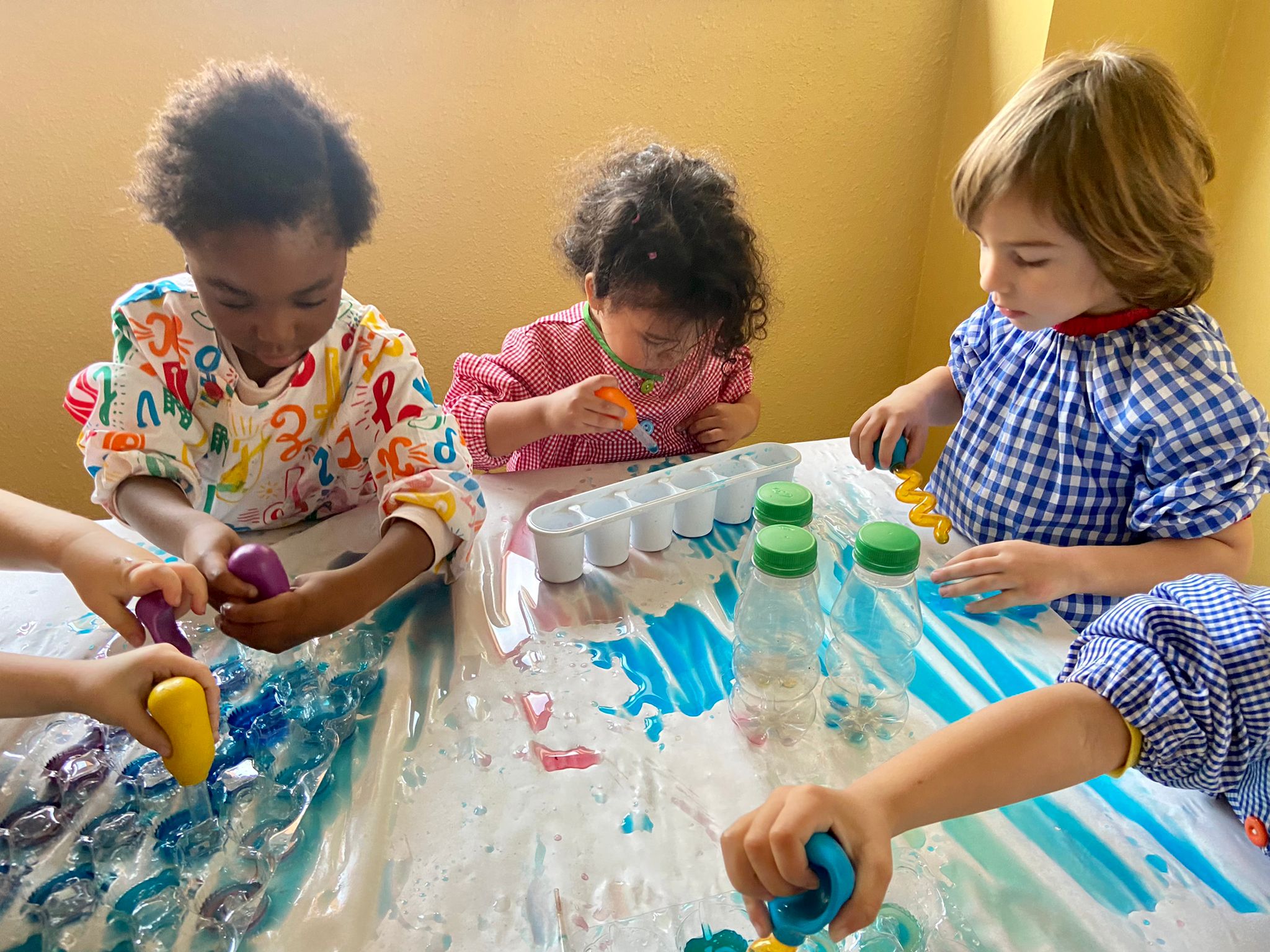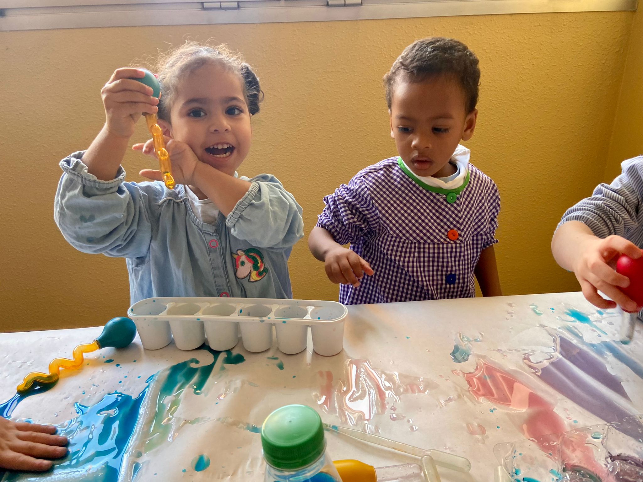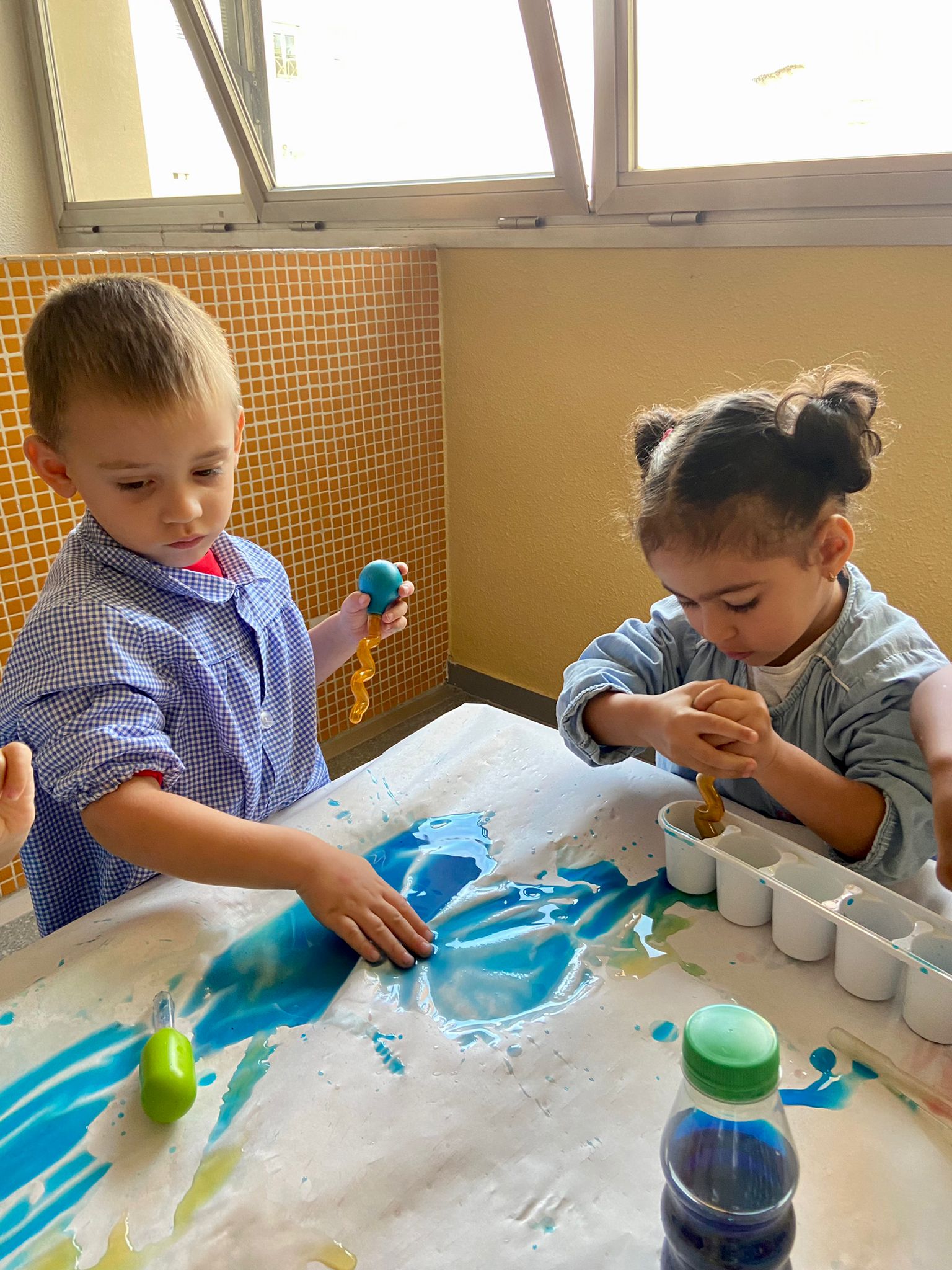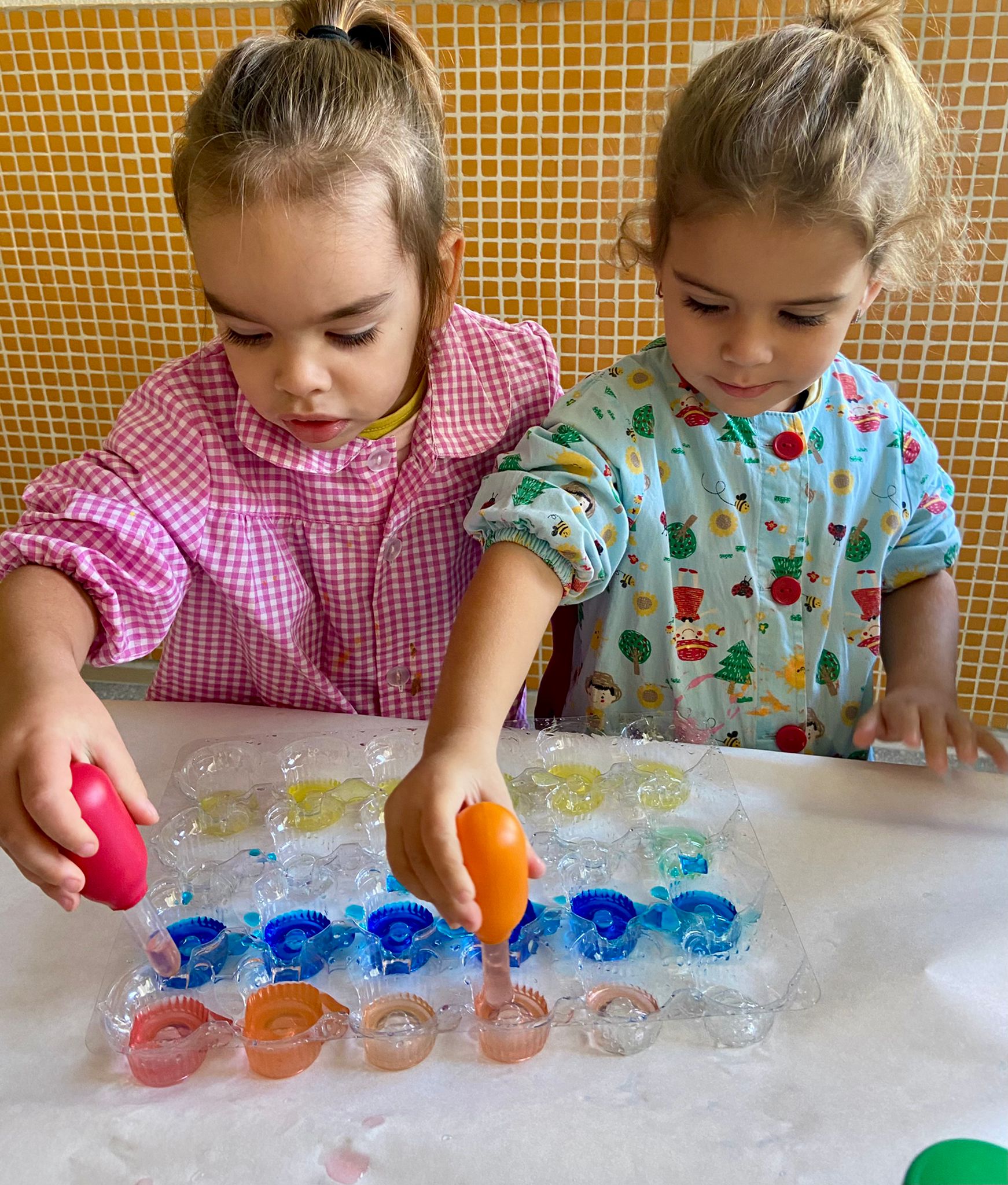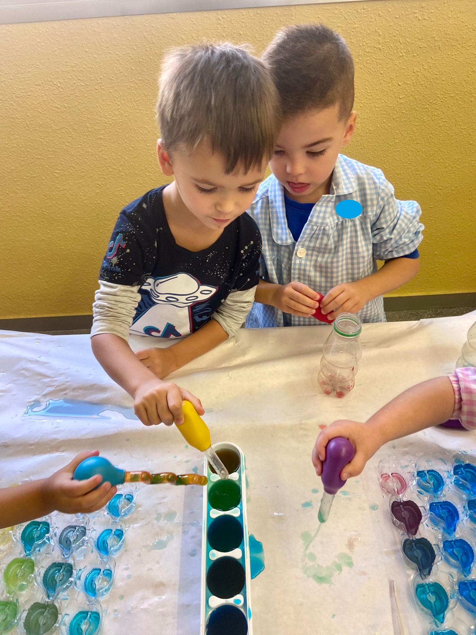 La setmana passada vam experimentar amb aigua i colorant els colors vermell, blau i groc. Vam descobrir que amb la barreja de vermell i blau sorgia el color lila, amb la barreja de vermell i groc apareixia el color taronja i amb la barreja de color blau i groc es creava el color verd. També vam descobrir que el fet de posar més o menys quantitat d’aigua variava la tonalitat d’aquesta. Ens va agradar molt fer aquesta experiència!