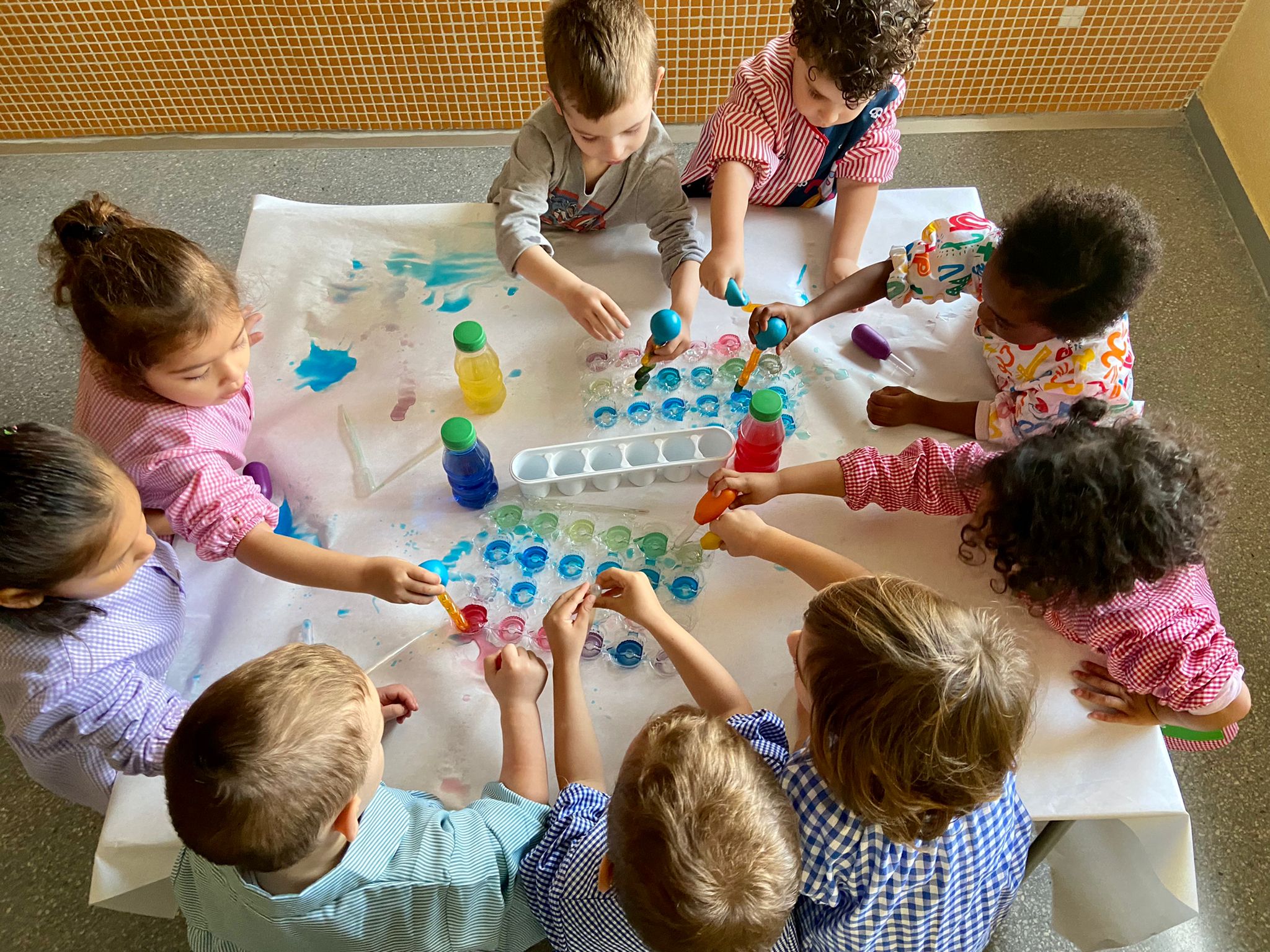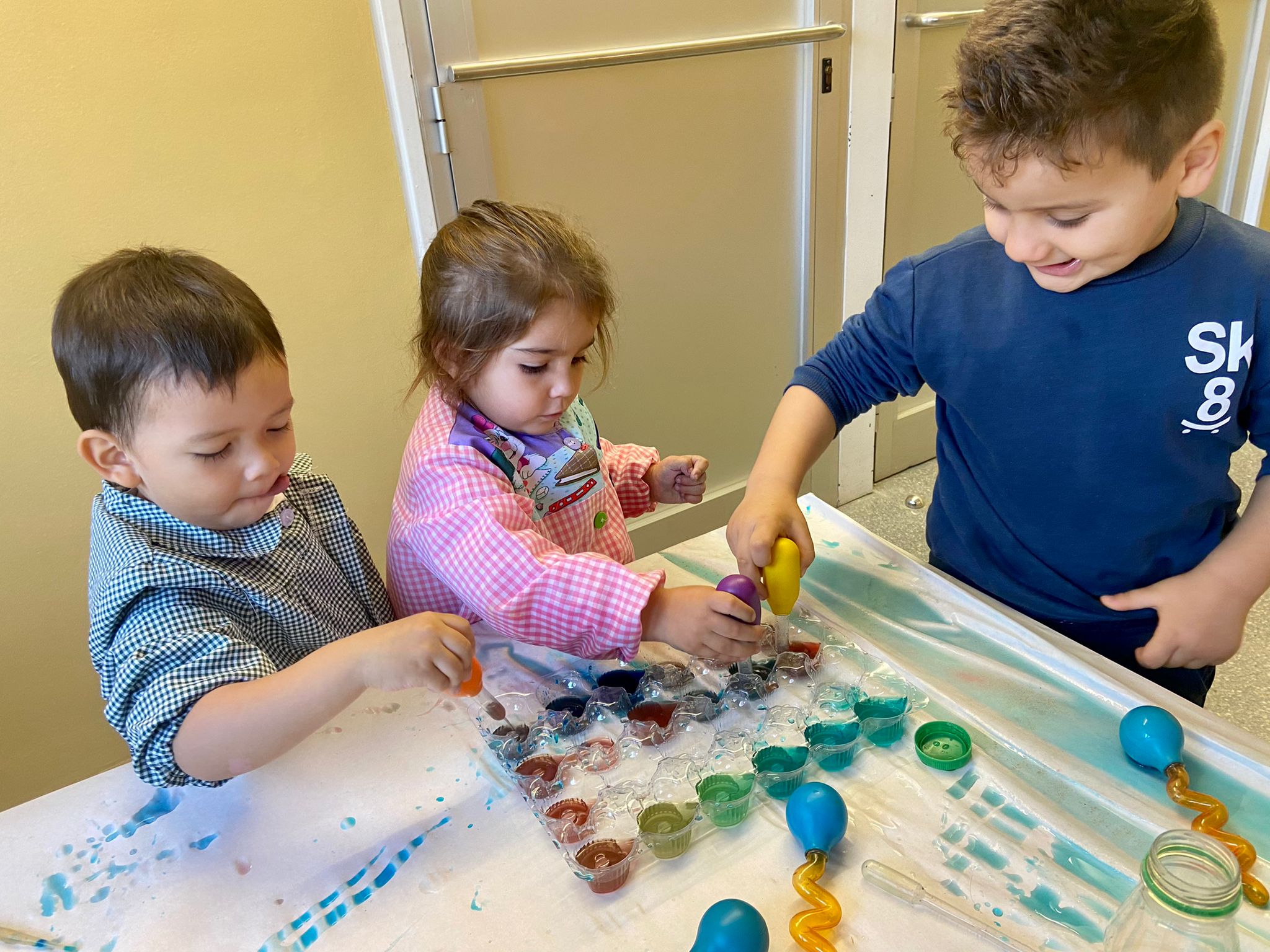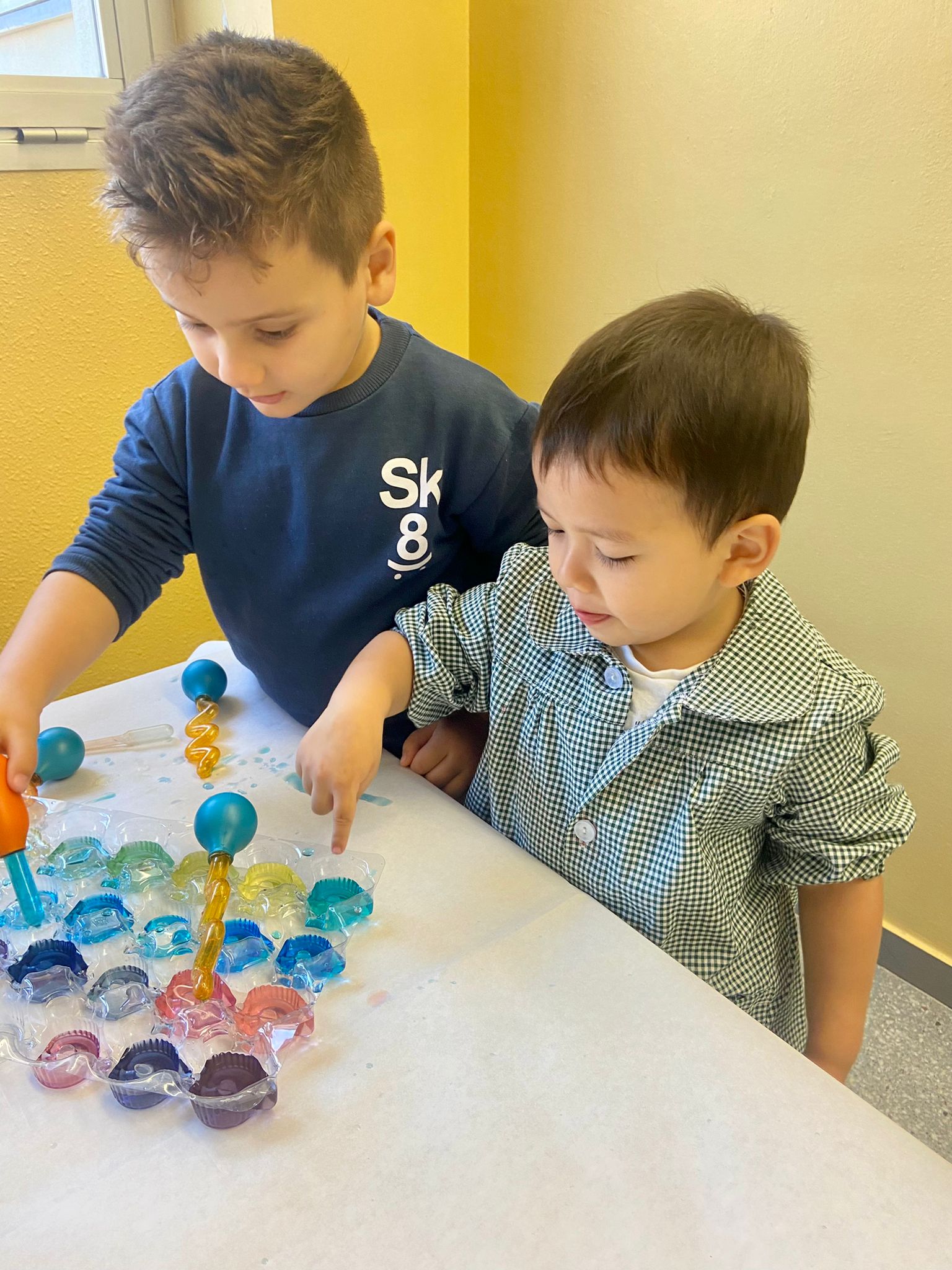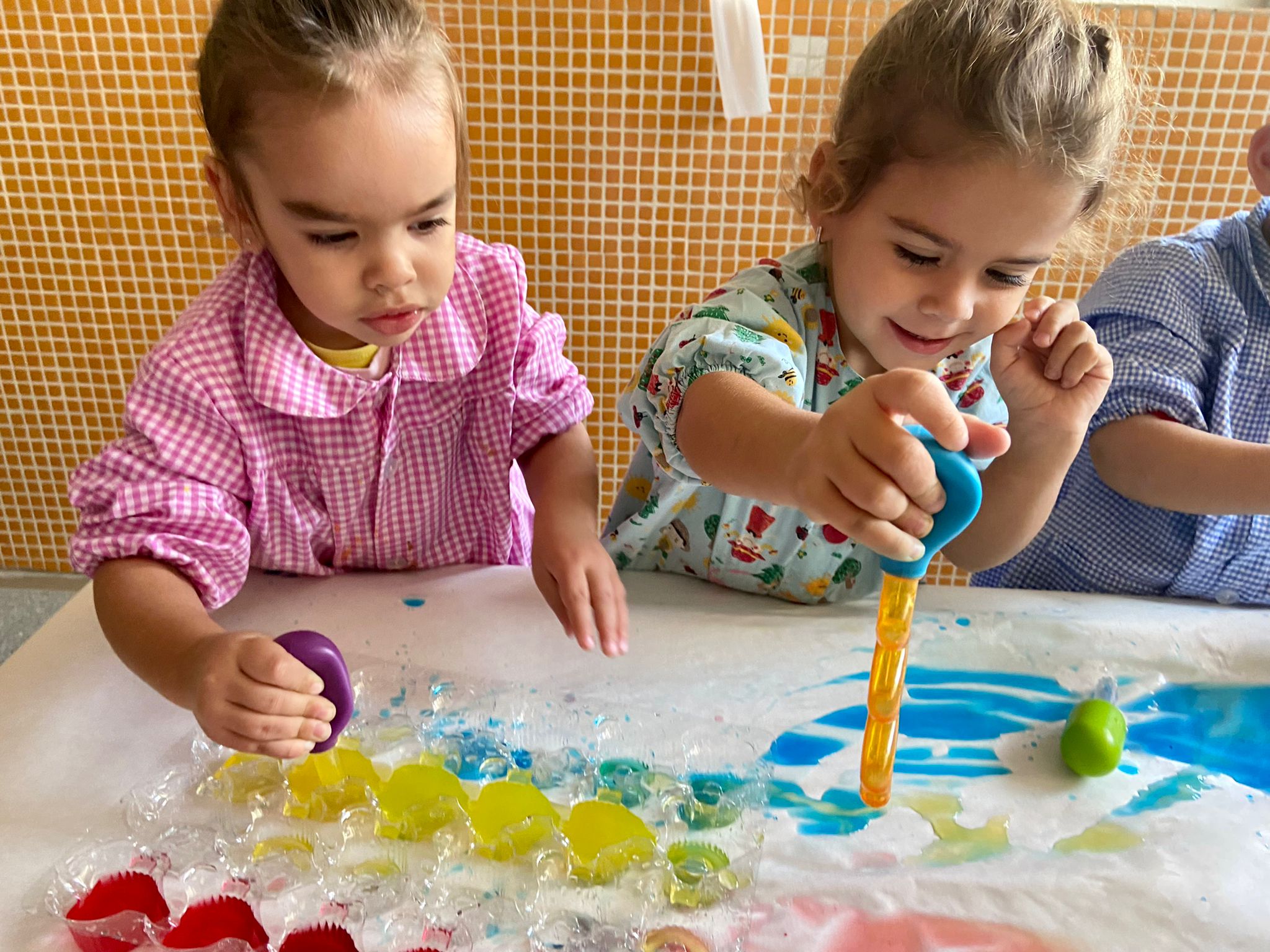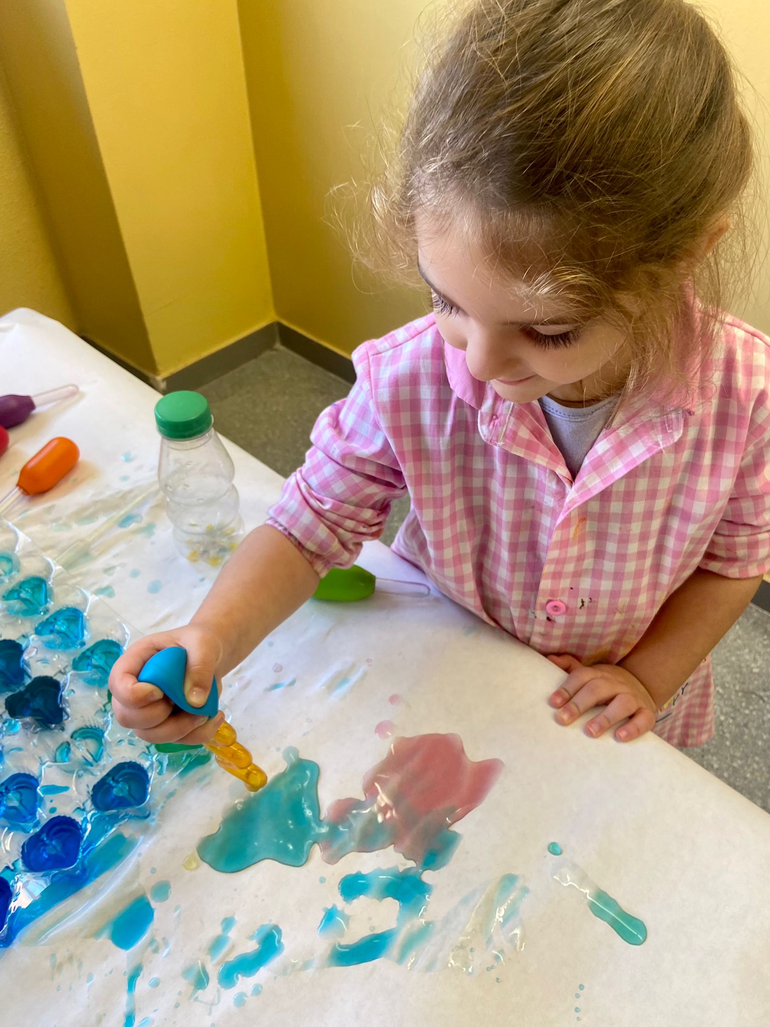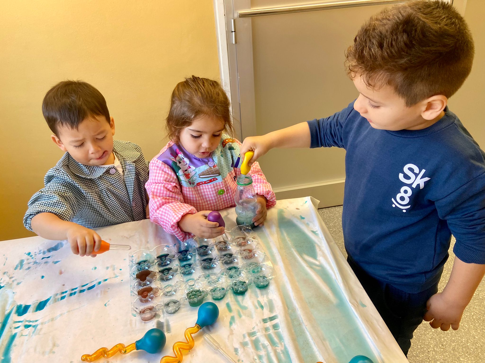 La setmana passada vam experimentar amb aigua i colorant els colors vermell, blau i groc. Vam descobrir que amb la barreja de vermell i blau sorgia el color lila, amb la barreja de vermell i groc apareixia el color taronja i amb la barreja de color blau i groc es creava el color verd. També vam descobrir que el fet de posar més o menys quantitat d’aigua variava la tonalitat d’aquesta. Ens va agradar molt fer aquesta experiència!