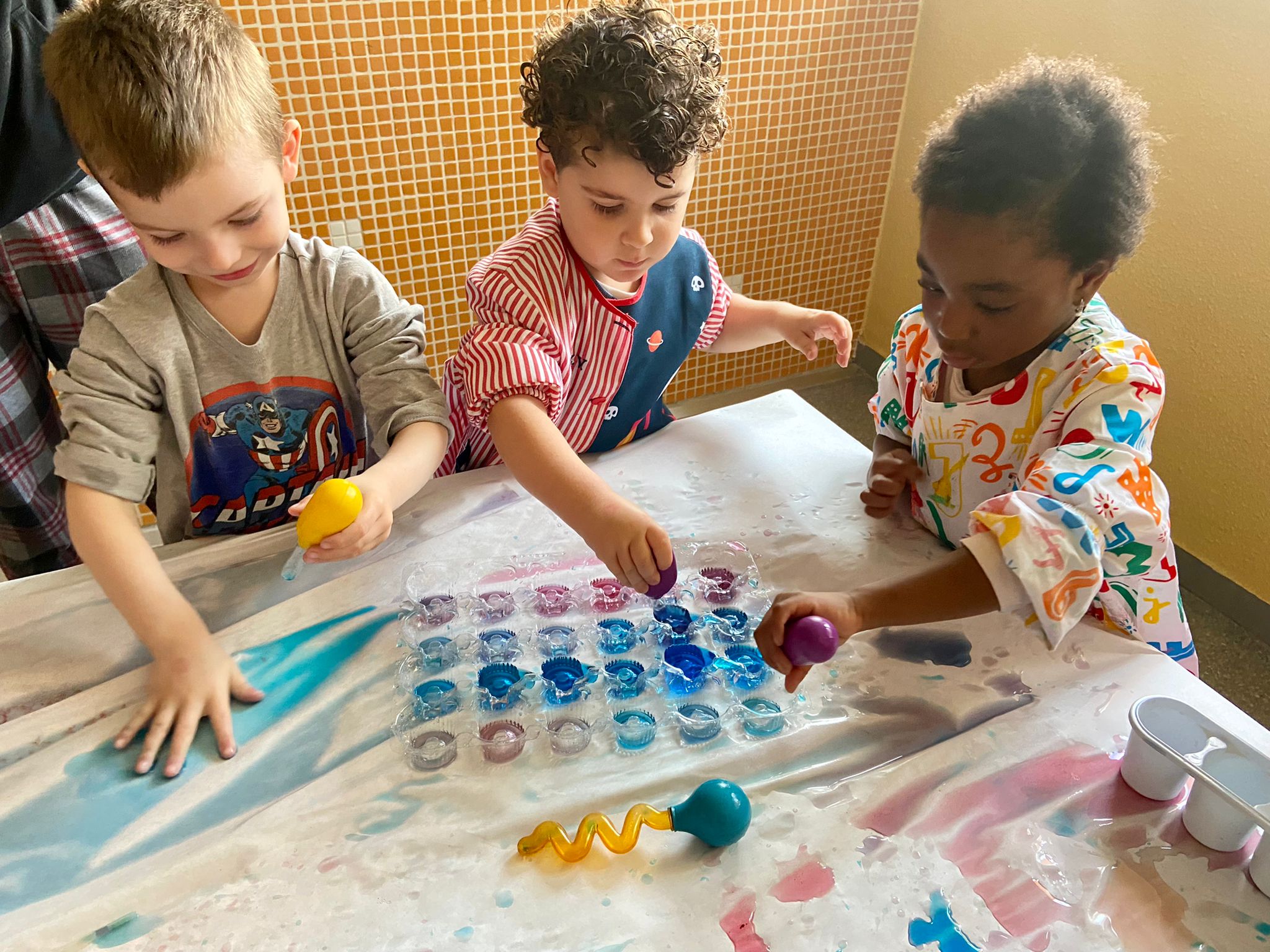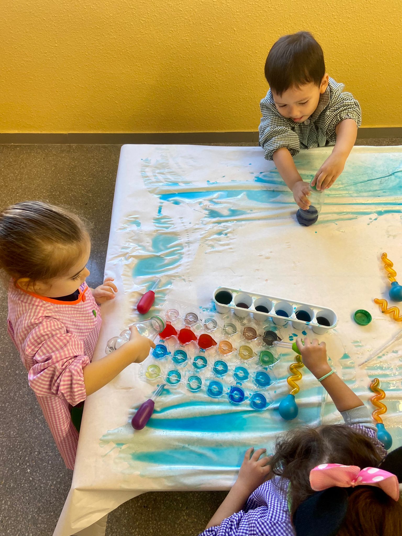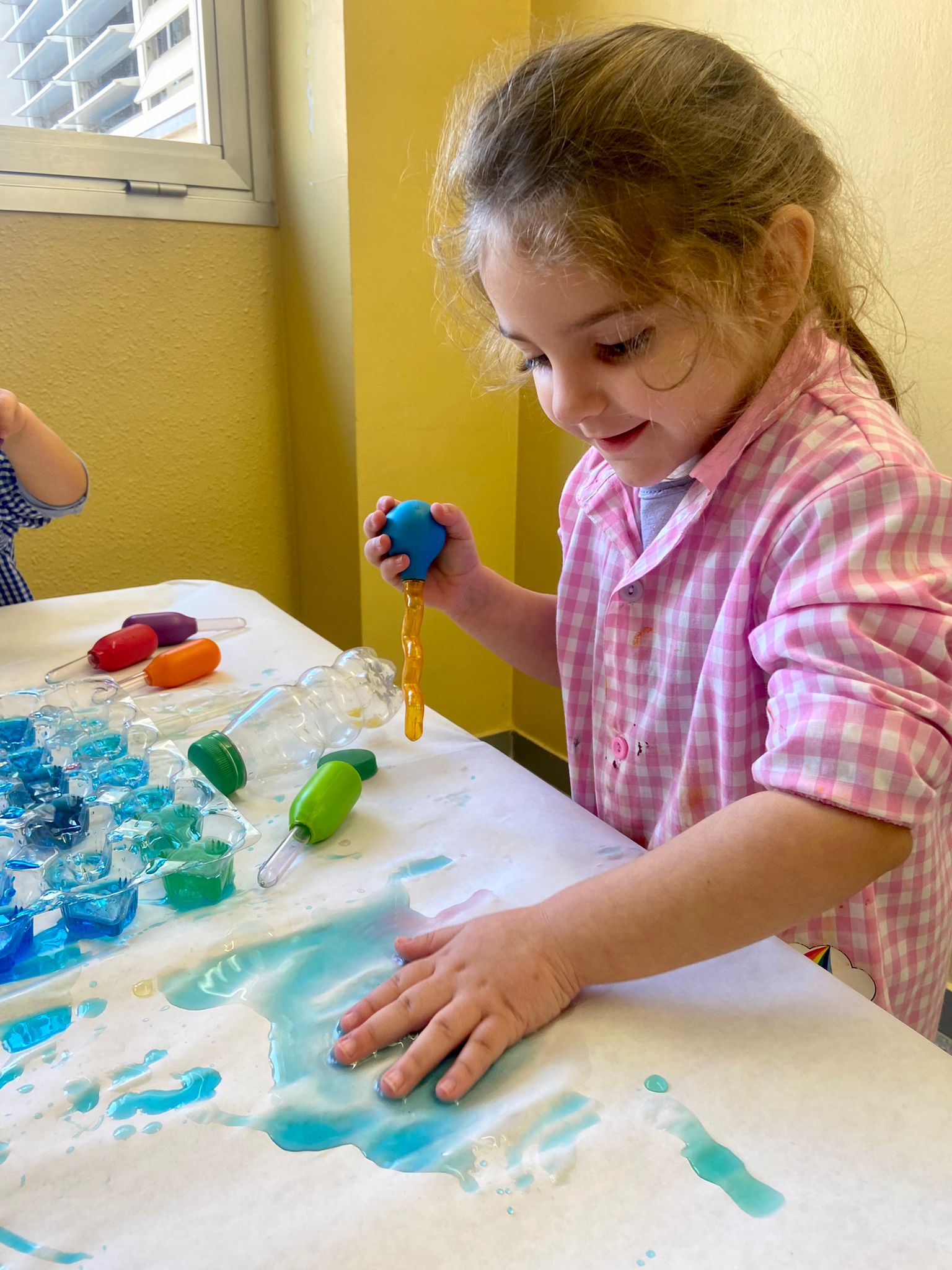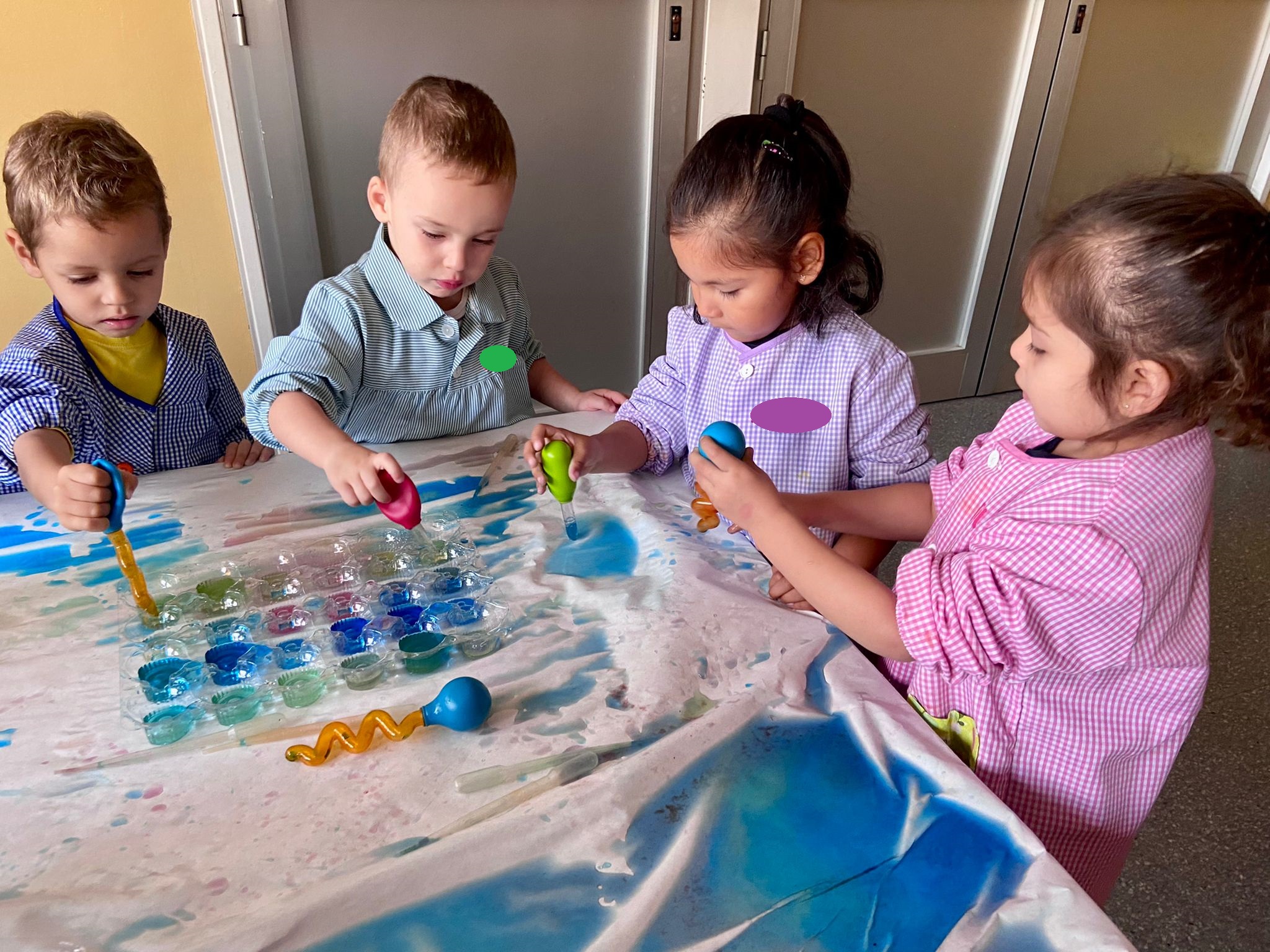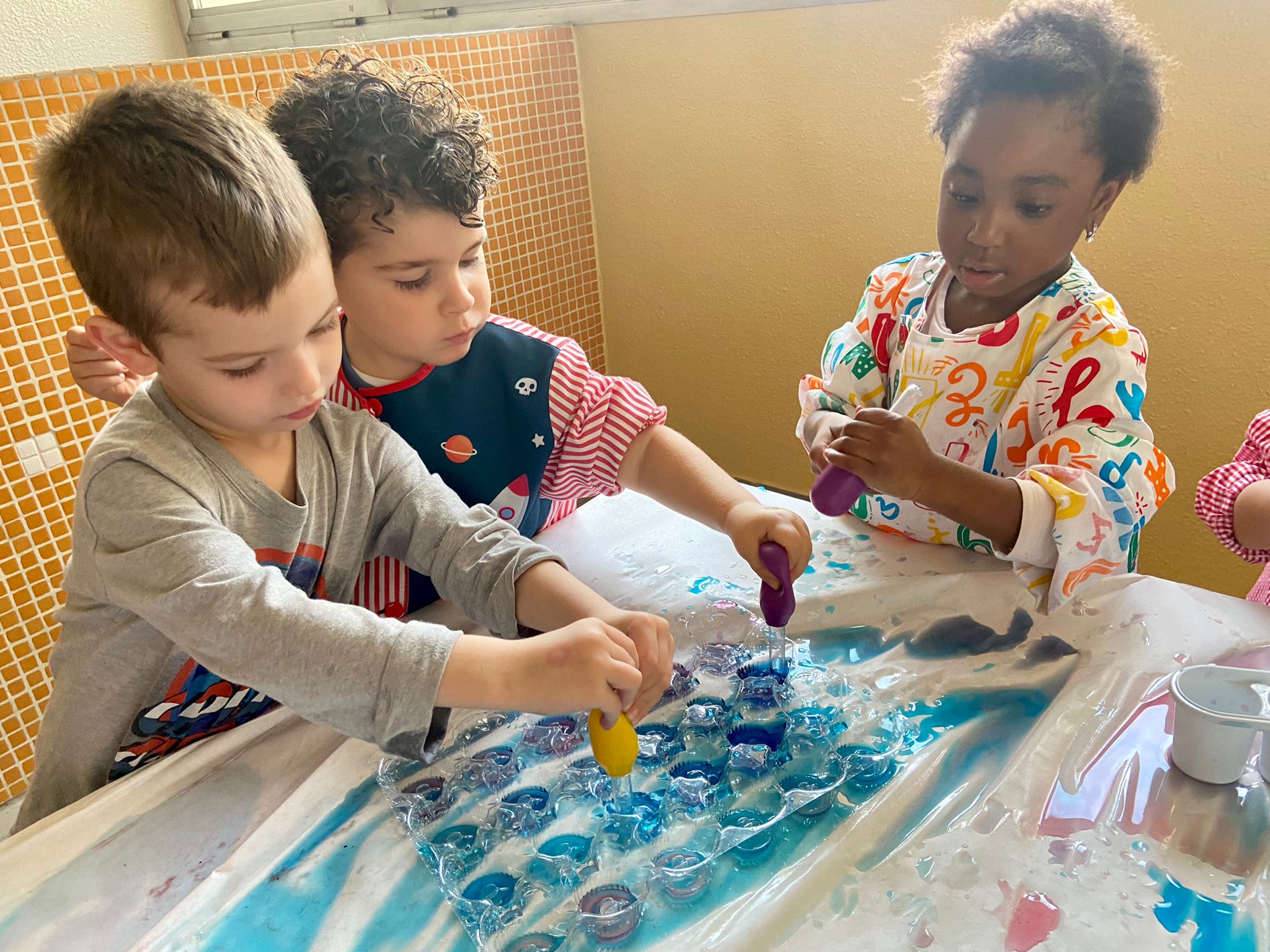 La setmana passada vam experimentar amb aigua i colorant els colors vermell, blau i groc. Vam descobrir que amb la barreja de vermell i blau sorgia el color lila, amb la barreja de vermell i groc apareixia el color taronja i amb la barreja de color blau i groc es creava el color verd. També vam descobrir que el fet de posar més o menys quantitat d’aigua variava la tonalitat d’aquesta. Ens va agradar molt fer aquesta experiència!