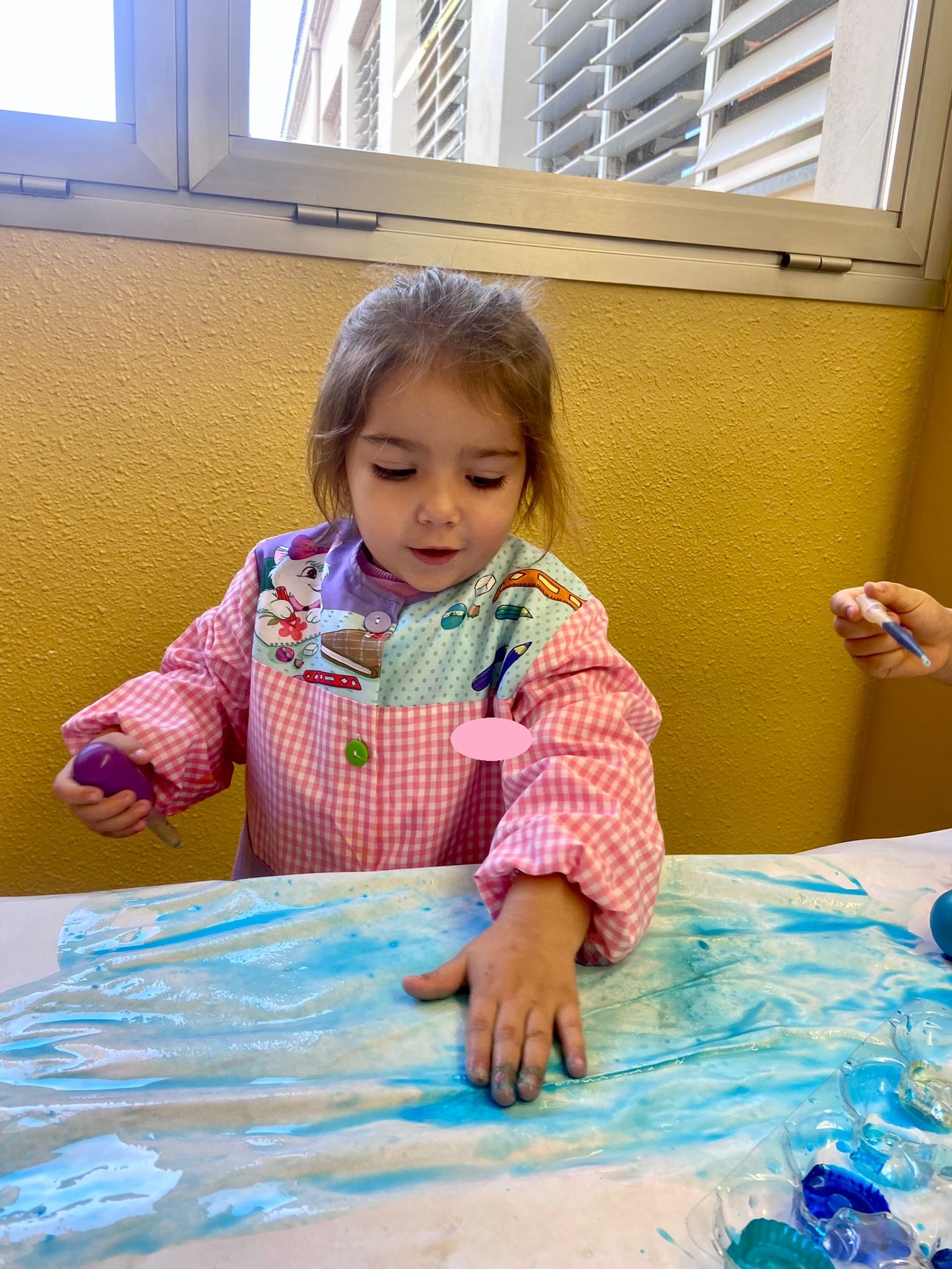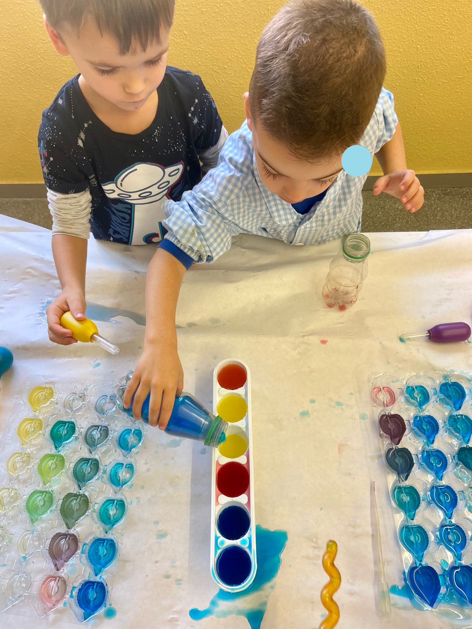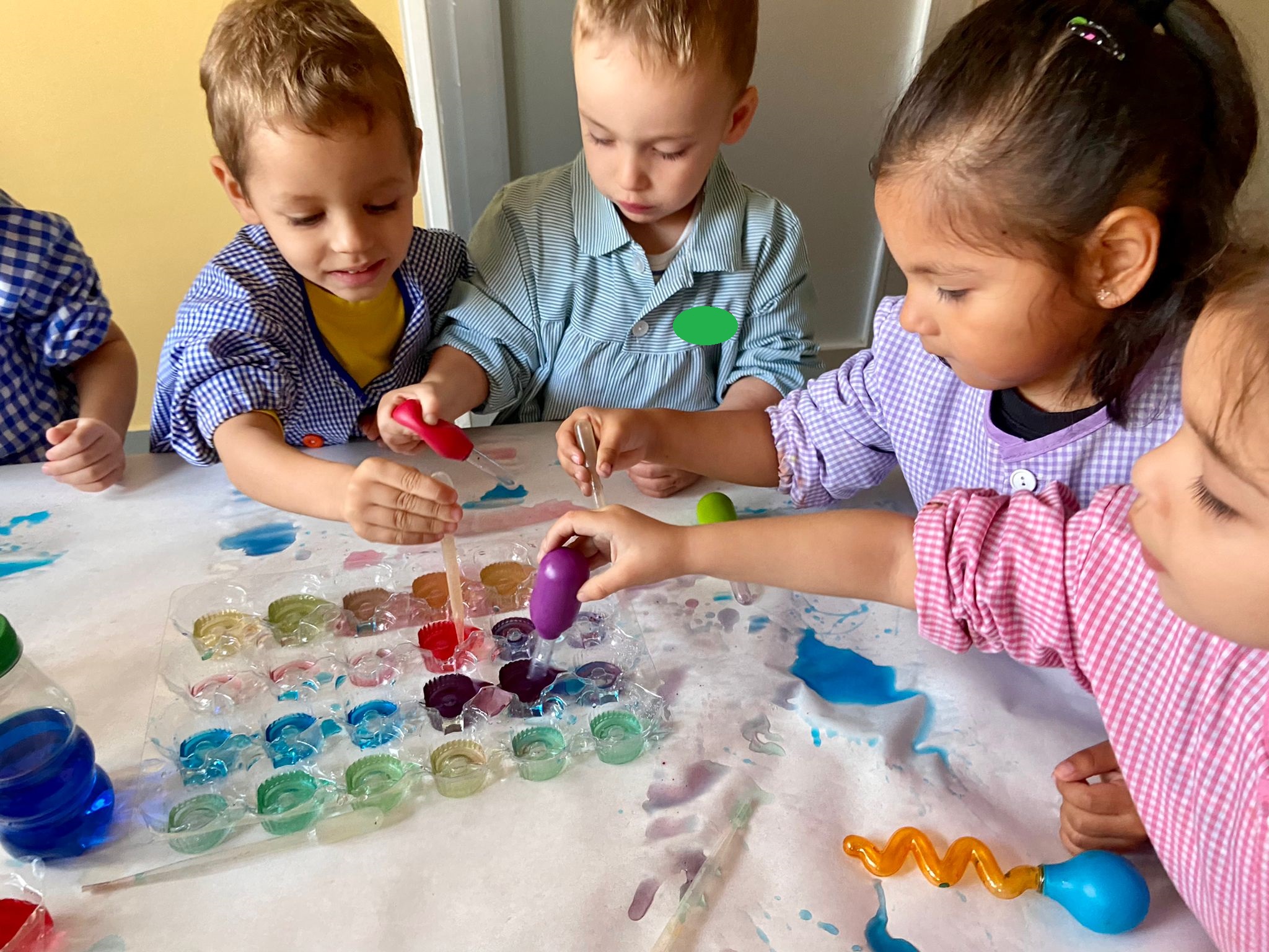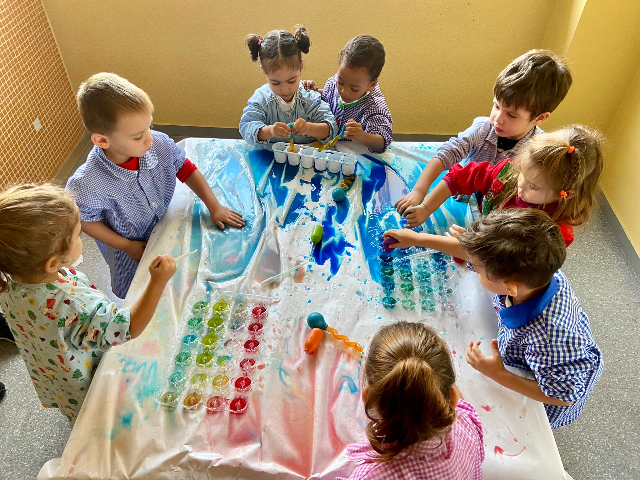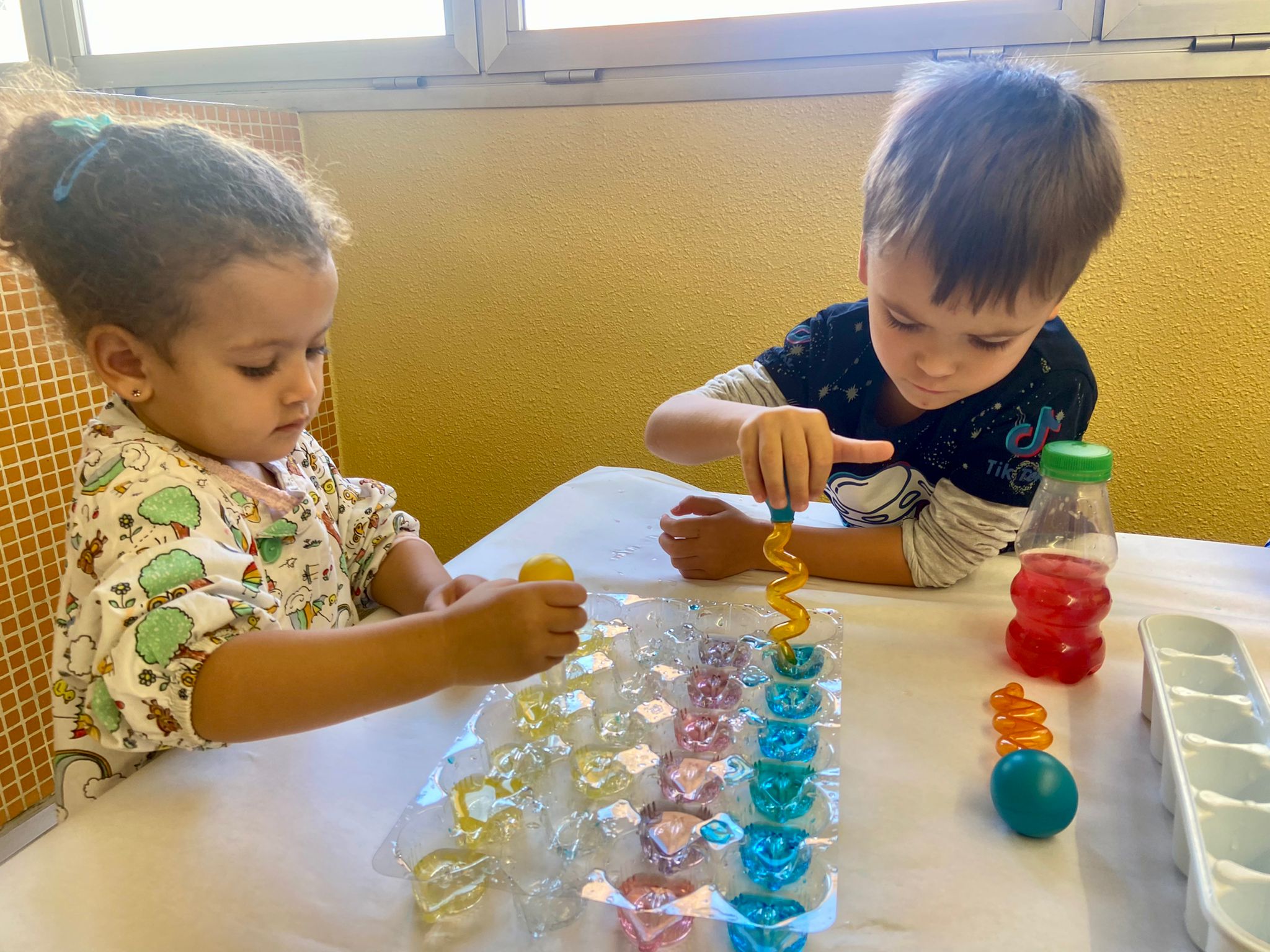 La setmana passada vam experimentar amb aigua i colorant els colors vermell, blau i groc. Vam descobrir que amb la barreja de vermell i blau sorgia el color lila, amb la barreja de vermell i groc apareixia el color taronja i amb la barreja de color blau i groc es creava el color verd. També vam descobrir que el fet de posar més o menys quantitat d’aigua variava la tonalitat d’aquesta. Ens va agradar molt fer aquesta experiència!
