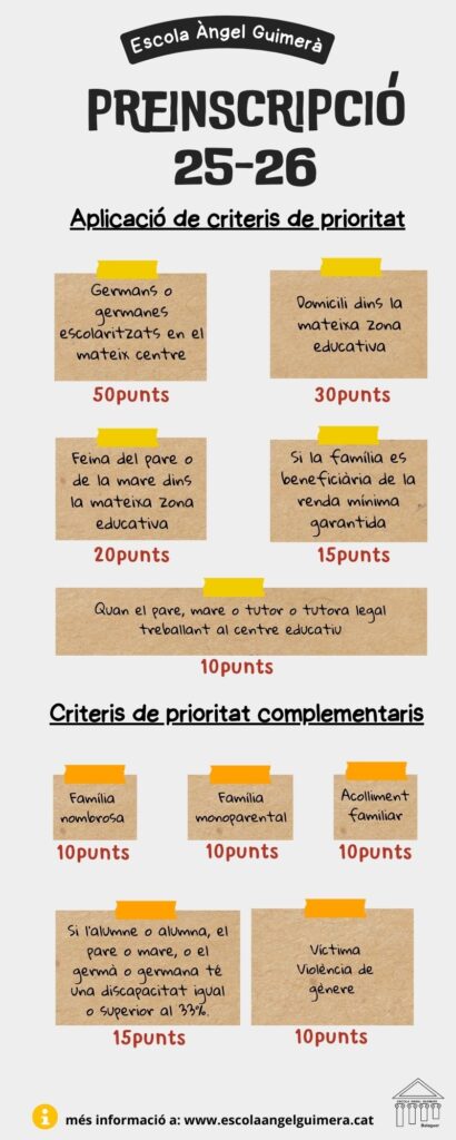 D’acord amb la Resolució EDF/319/2025, de 4 de febrer, per la qual s’aproven les normes de preinscripció i matrícula d’alumnes als centres del Servei d’Educació de Catalunya i altres centres educatius, en els diversos ensenyaments sostinguts amb fons públics, us compartim els criteris de prioritat que s’especifiquen en l’annex 2 de la mateixa resolució , apartat 5.