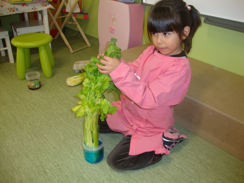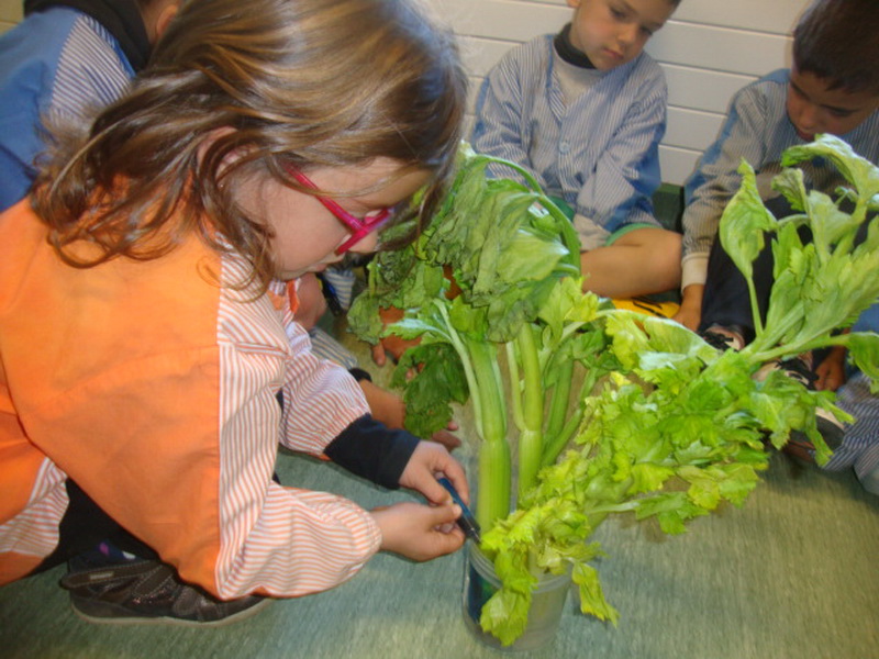 Observem la capacitat d’absorció de les plantes, elaborem colors secundaris, experimentem jugant amb llums, observem què passa quan posem un ou en vinagre durant uns dies, i observem com creixen tres llavors cuidades de forma diferent.