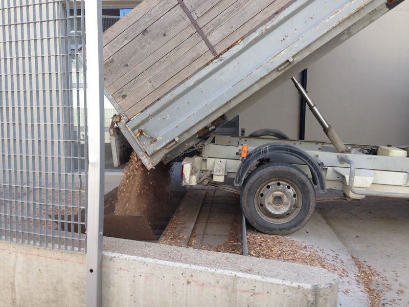 La biomassa surt del dipòsit, passa cap a un bisenfi, el qual la fa caure sobre el plat giratori, llavors va cap a un altre bisenfi que porta l’estella al cremador de la caldera. El foc escalfa els tubs bobinats de l’interior, pels quals hi passa l’aigua en circulació, que va cap al dipòsit d’expansió el qual té la missió de mantindre l’aigua sempre a la temperatura adequada.