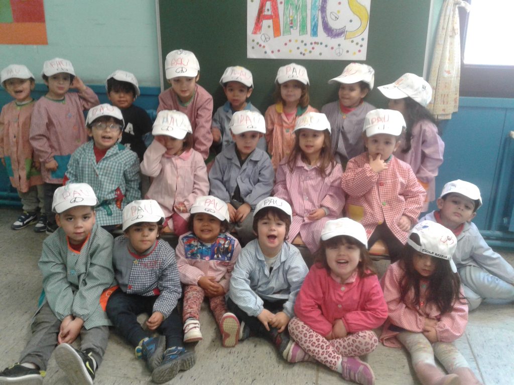 Els alumnes de P.3,P.4 i P.5 hem celebrat el dia de la pau, conjuntament amb tota l’escola! Tots amb les nostres gorres i les nostres mantes solidàries!