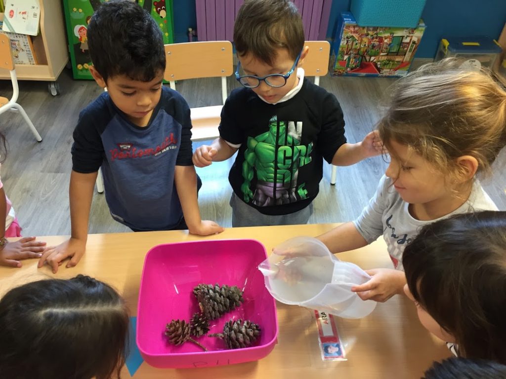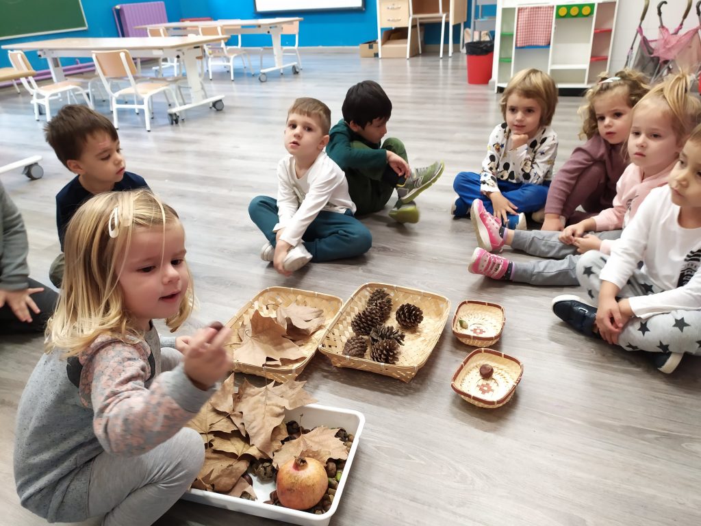 Quan va arribar la tardor vam començar a portar elements de la natura per poder treballar a l’aula i quan ja tenien la safata plena vam classificar els elements ens diferents safates. A més a més, van portar una magrana i vam mirar el seu color per fora i per dins, el seu tacte i