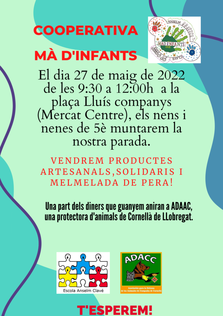 La nostra cooperativa Mà d’Infants va començar al setembre de 2021. Mà d’Infants va néixer arran d’un projecte d’emprenedoria de l’escola que ens van demanar fer a 5è i també perquè ens agrada molt ser solidaris i amables amb l’entorn social. Ens van organitzar per comissions: la comissió de publicitat, de producció, de fotografia i