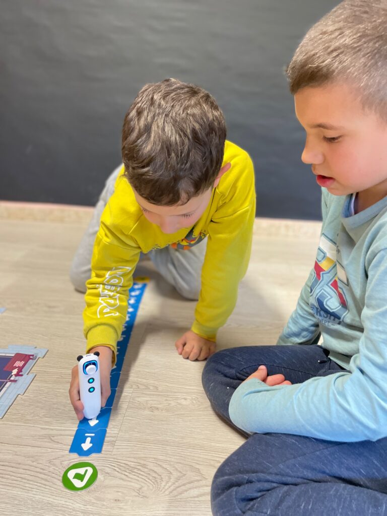 Durant les sessions de robòtica del trimestre, els nens i nenes de 2n han aprofundit en la resolució de reptes amb l’mTiny. Pels qui no el coneixeu, és un robot compacte molt simpàtic. Per fer-lo funcionar, els infants construeixen seqüències d’instruccions fent servir unes peces de cartró semblants a les d’un trencaclosques. Després, les graven a la memòria del robot fent servir un comandament que funciona com un llapis i, quan toquen la fitxa d’acció, el robot executa les accions. L’mTiny és especialment divertit perquè interacciona amb les targetes, expressa emocions amb els ulls, parla, emet sons i música. Als més petits els fascina, ja que és molt expressiu i divertit.