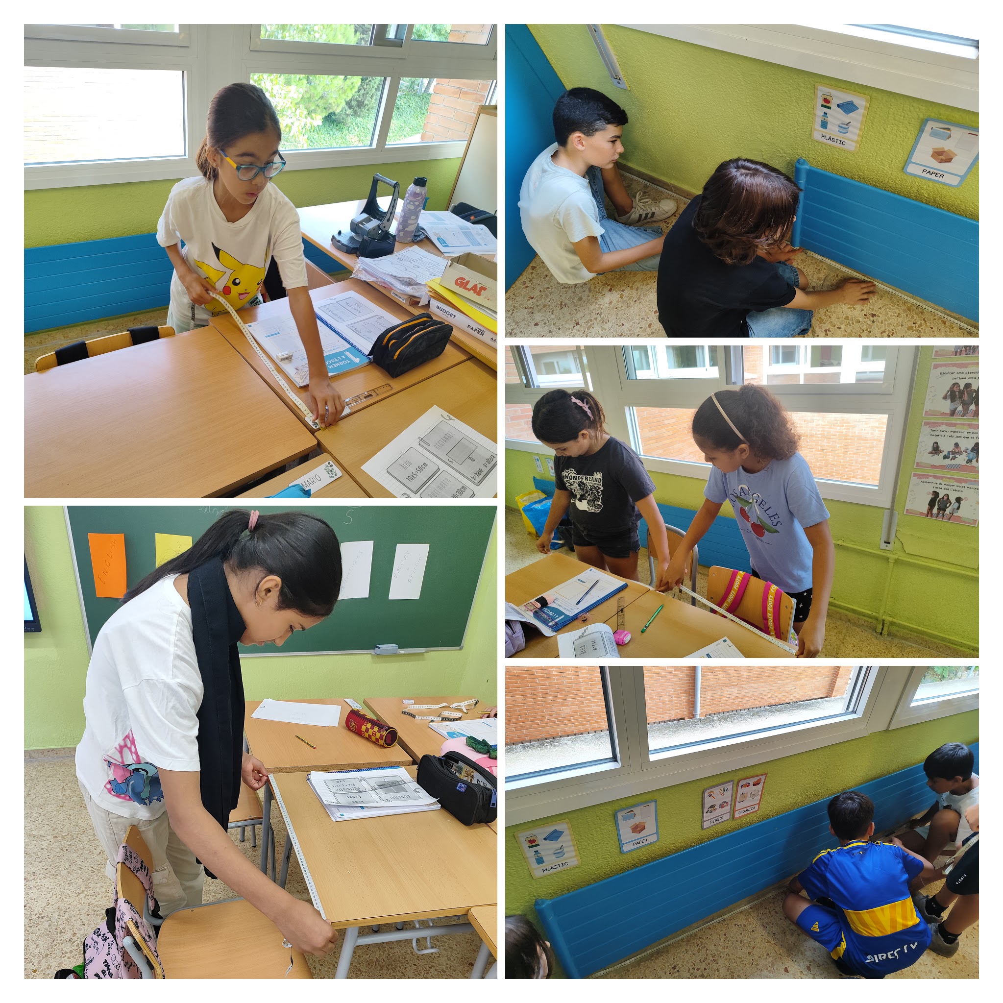Amb l’ajuda de cintes mètriques i les fórmules matemàtiques corresponents, els nens i nenes han mesurat diferents elements de la seva aula: la superfície del terra, les taules i les finestres. A partir d’aquestes dades han pogut descobrir com s’aplica la geometria en el nostre entorn més proper.