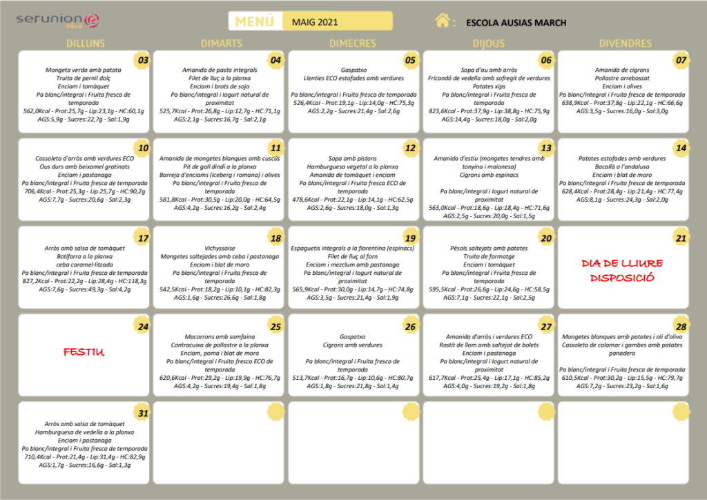 Menús de maig: general, sense fruits secs, sense lactosa, sense porc, disfagia i recomanacions sopars