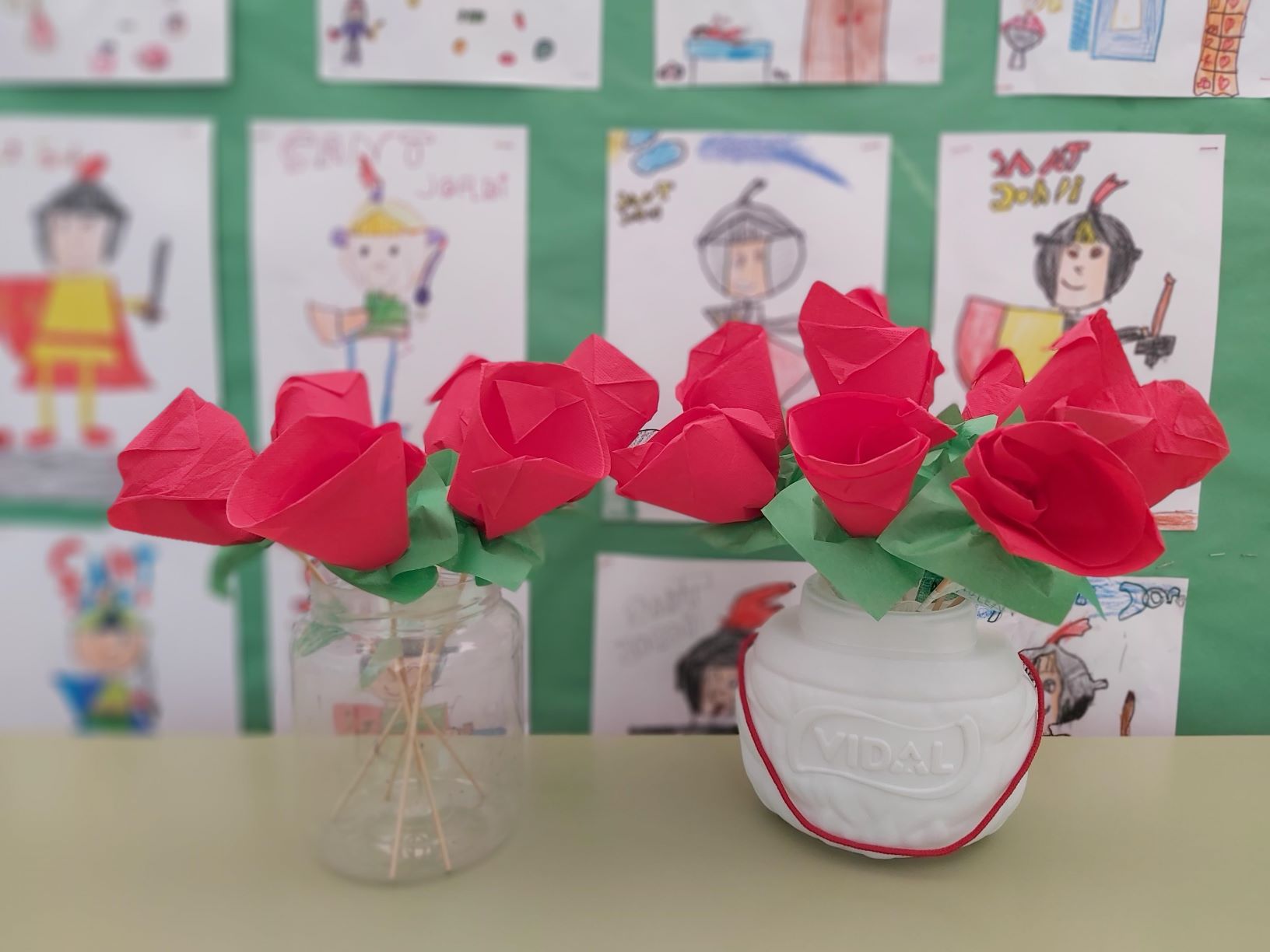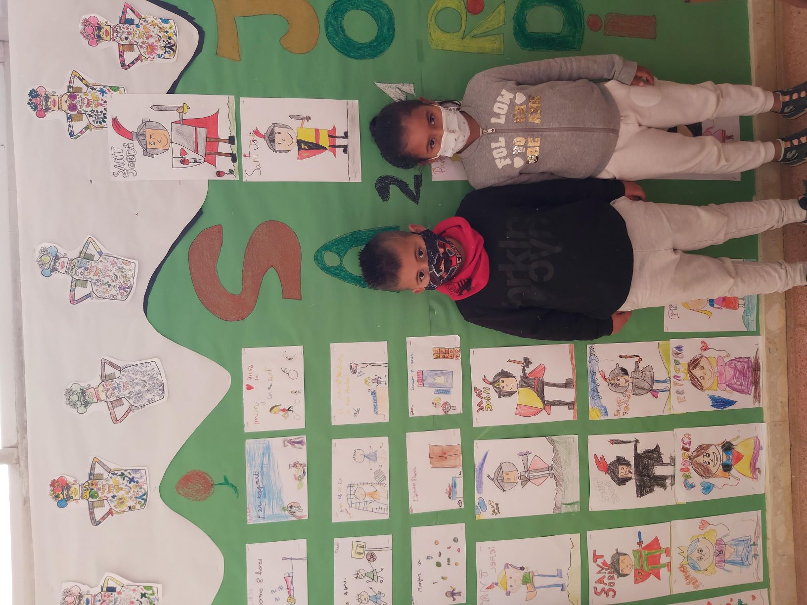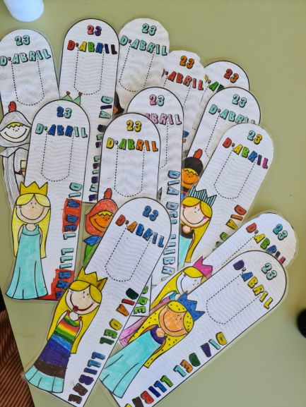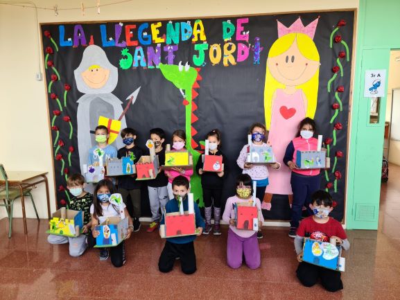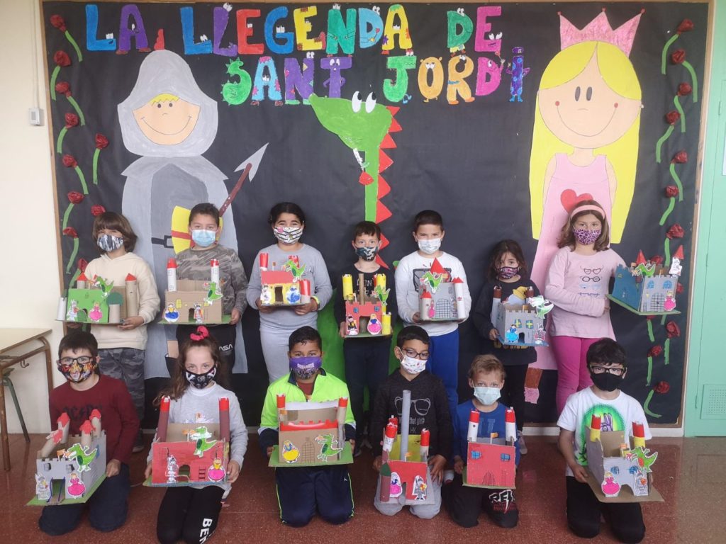 El punt de partida ha estat explicar i veure la llegenda del cavaller, el drac i la princesa. A partir d’aquí i al llarg de la setmana hem elaborat petites produccions literàries, poemes i frases il·lustrades, petits dibuixets on l’alumnat ha recreat els diferents personatges i alguns elements de la llegenda, la construcció del castell amb els personatges de la llegenda, un taller de rosa de Sant Jordi i el tradicional punt de llibre.