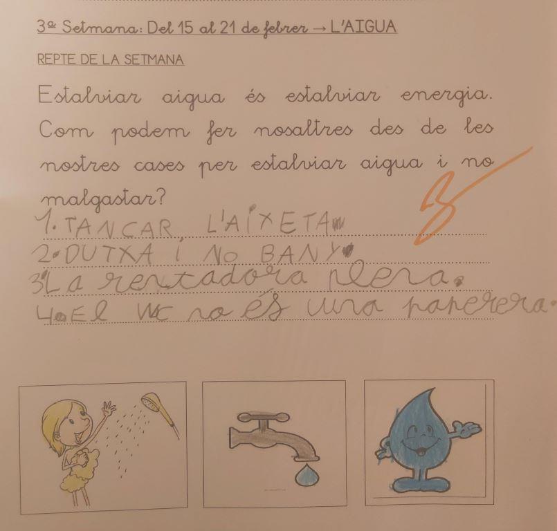 En la tercera setmana de febrer treballem el tema de l’estalvi d’AIGUA, dins la VI Marató RE-M de l’energia. En aquests dies se’ns han plantejat uns reptes molt interessants, com per exemple què podem fer nosaltres des de les nostres llars per estalviar aigua i com a conseqüència, estalviar energia.