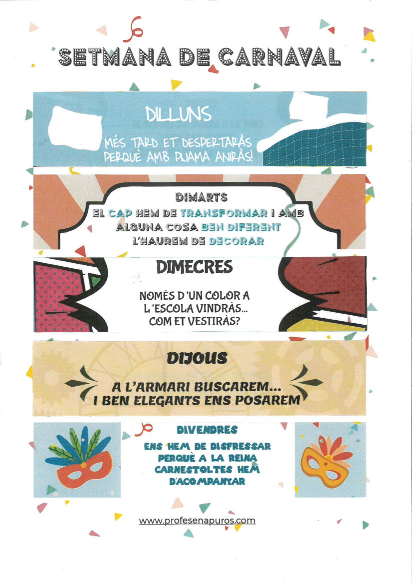 • Divendres ens hem de disfressar perquè a la reina Carnestoltes hem d’acompanyar.