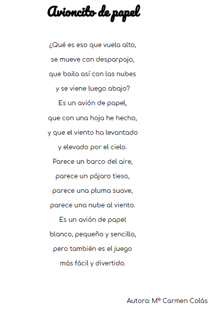 1. ¿Os acordáis del último poema que recitamos en clase, el del Avioncito de papel? Aquí lo teneís para leerlo de nuevo: