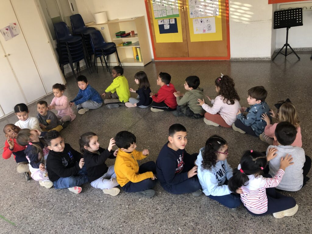 Primer hem escoltat amb atenció la neu com cau, tot visualitzant-la amb els ulls tancats. Després, la Marta ens ha fet un massatge amb un pinzell per tal que notéssim com queien les volves de neu sobre el nostre cos (cap, mans, esquena…). Finalment, hem acabat fent una rotllana i fent-nos un massatge amb els dits entre nosaltres.