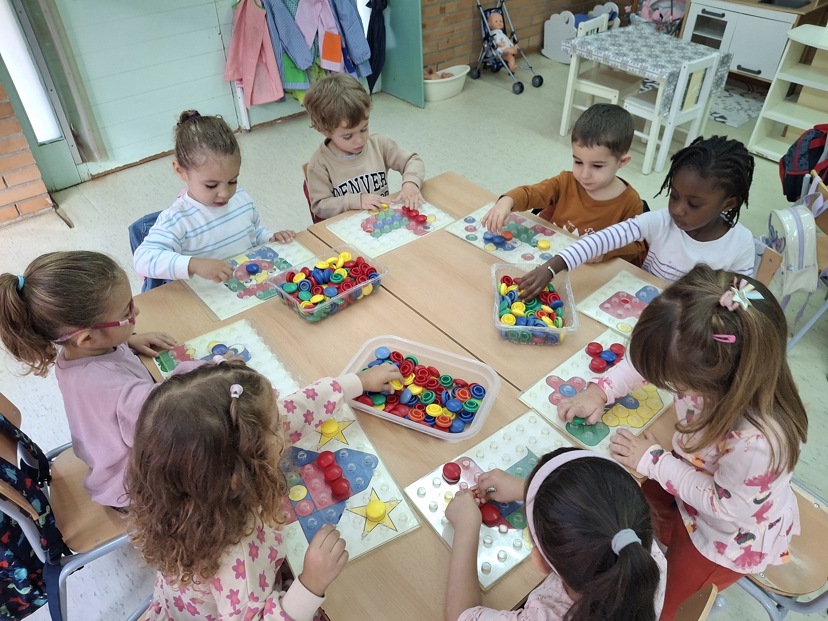 A l’escola treballem per racons al llarg de la setmana. És una forma de treball que ens permet plantejar diverses feines per fer en petit grup. Alguns racons són lliures i espontanis i d’altres impliquen l’aprenentatge d’unes normes com ara alguns jocs.