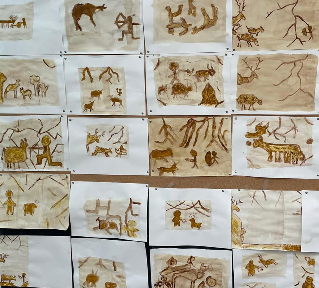 A cinquè, des de plàstica, hem representat pintures rupestres aprofitant que estem treballant l’etapa de la Prehistòria a History. Per fer-ho, hem utilitzat els mateixos materials/ingredients que els prehistòrics: cafè, espècies, xocolata, ou, etc.