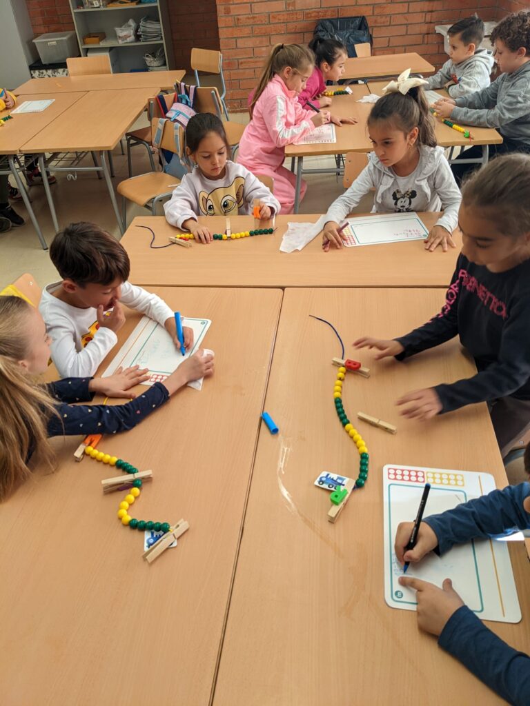 Els infants de primer cada vegada que volem aprendre un nou concepte matemàtic o una estratègia ho fem de forma manipulativa. Tenim cartes numèriques, peces multilink, un trenet amb boles de colors per aprendre a comptar, sumar i restar i una pissarra blanca individual per escriure les nostres solucions. Per començar la tutora ens proposa