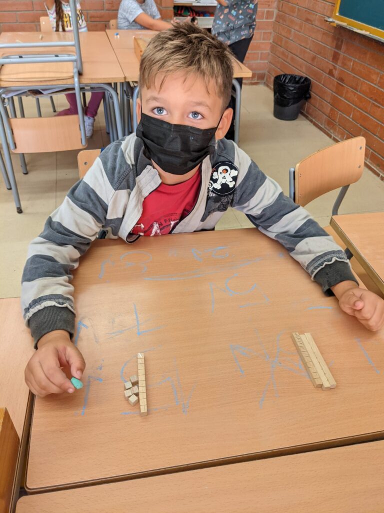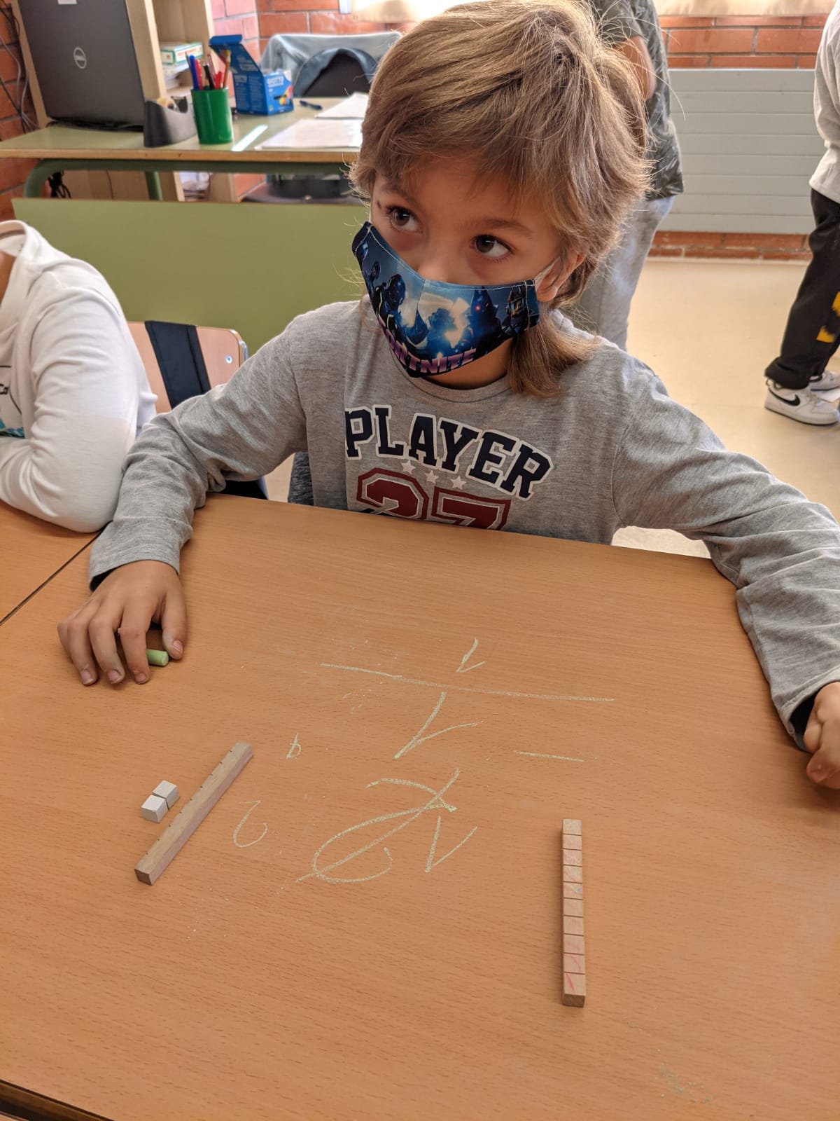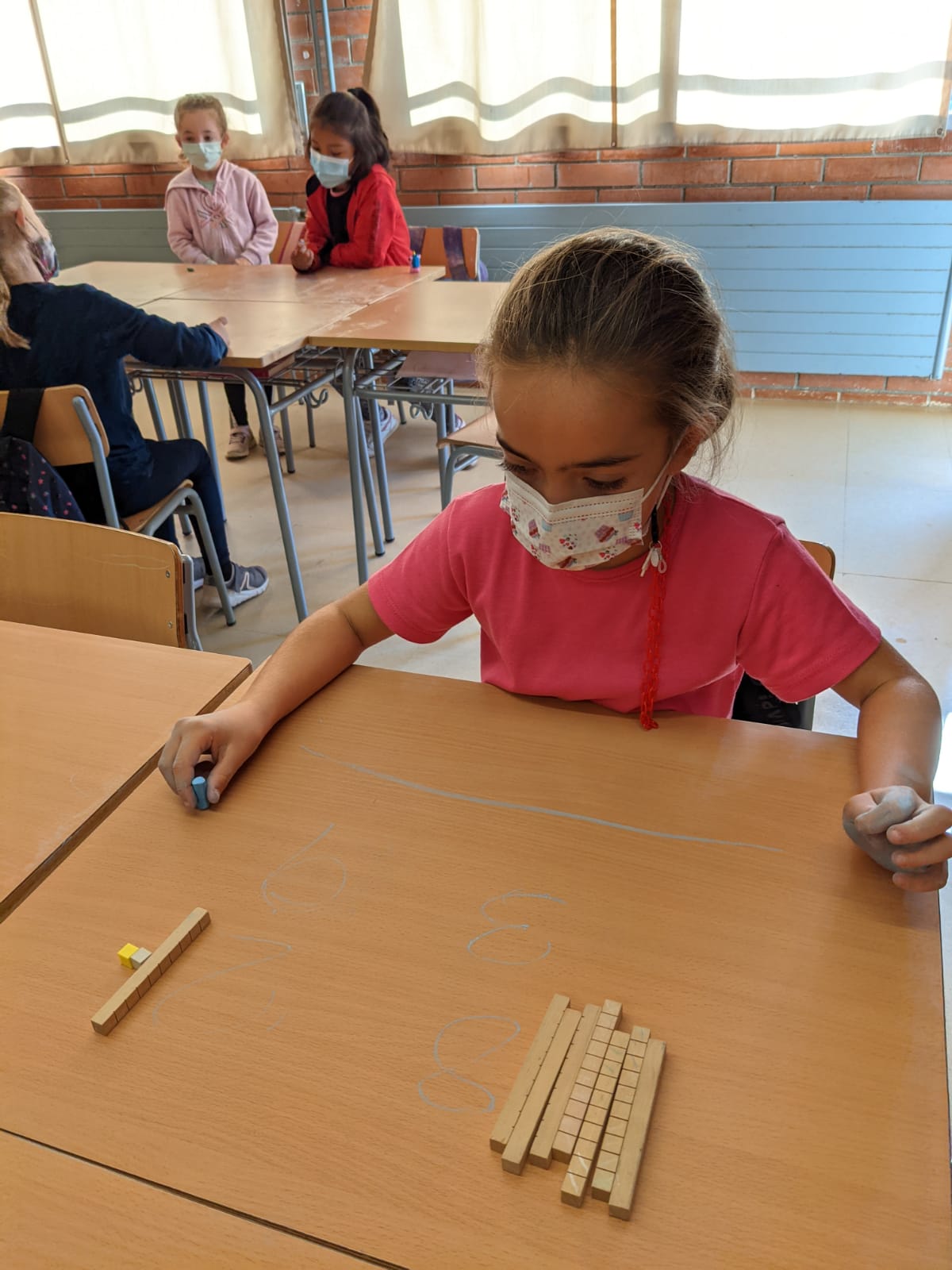 A  segon hem après a fer restes portant-ne. Primer hem après a distingir quines són les restes portant-ne i després amb material manipulatiu, amb els reglets, hem vist com podem fer més gran una unitat, demanant ajut  a la desena… Així és molt més fàcil investigar com es fa aquesta operació matemàtica (resta).