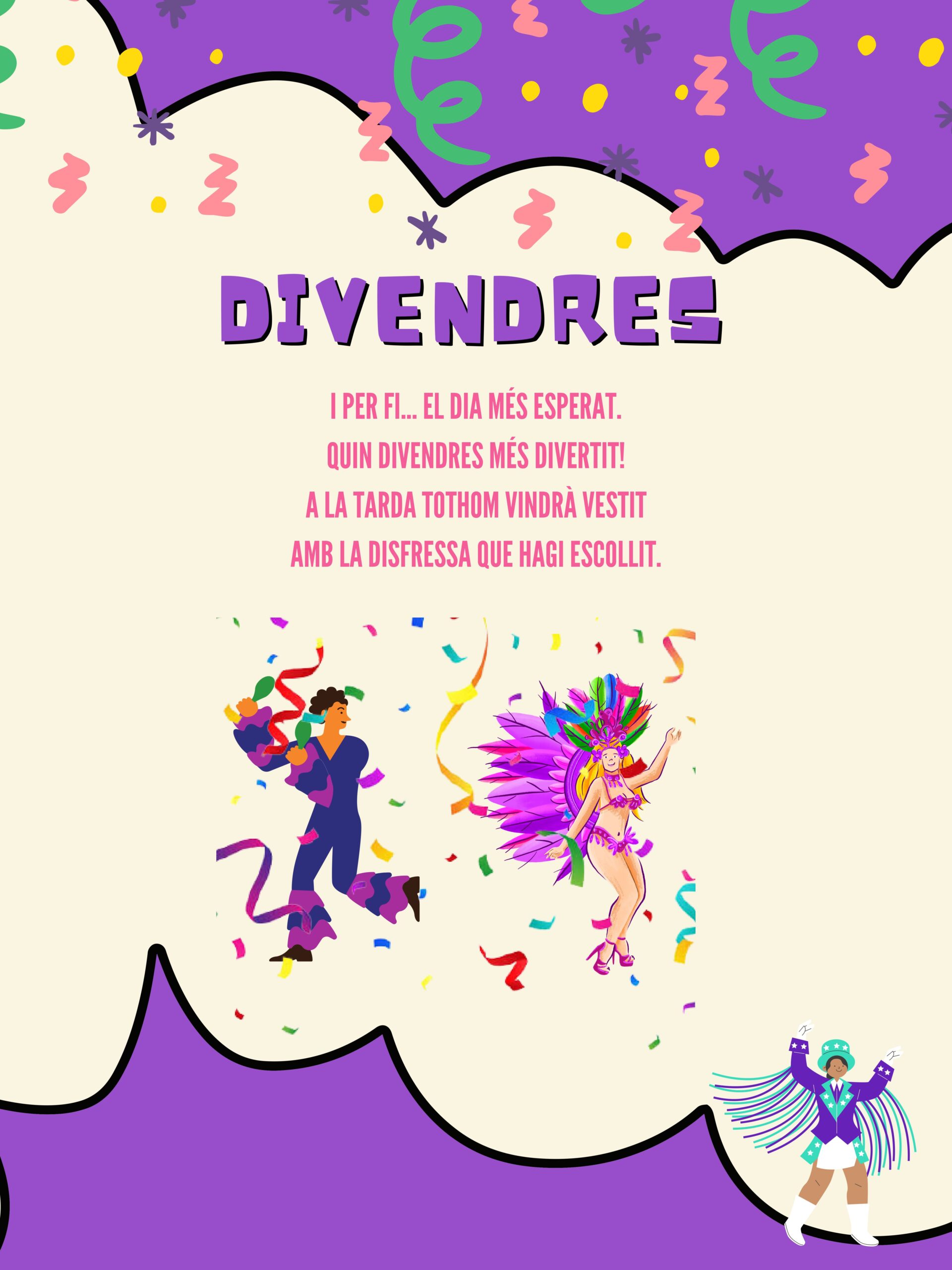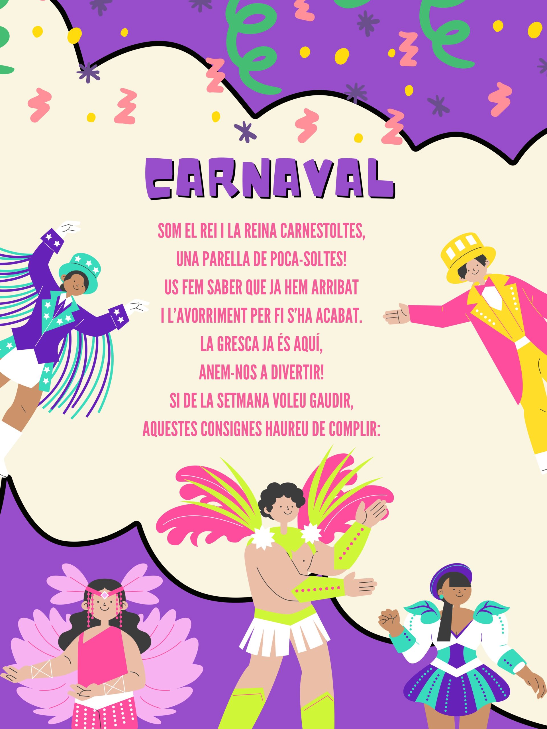 Consignes de Carnestoltes Feu un comentari / Per admin / 21 de febrer de 2025 / General Portada portada Ja ha arribat la gran setmana de Carnaval! El Rei i la Reina Carnestoltes ens han comunicat les consignes que haurem de complir al llarg d’aquesta setmana. Llums, colors, fervor i molta alegria. Benvinguts i benvingudes a la setmana més divertida!
