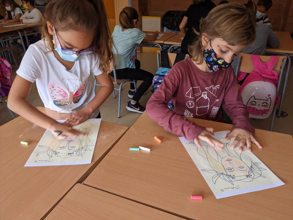 Aquesta és la nostra proposta de l’època rosa de Picasso. Hem escollit retrats femenins i els hem pintat amb guix. Per a nosaltres pintar amb guix i difuminar ha estat una tècnica nova i ho hem experimentat amb entusiasme.
