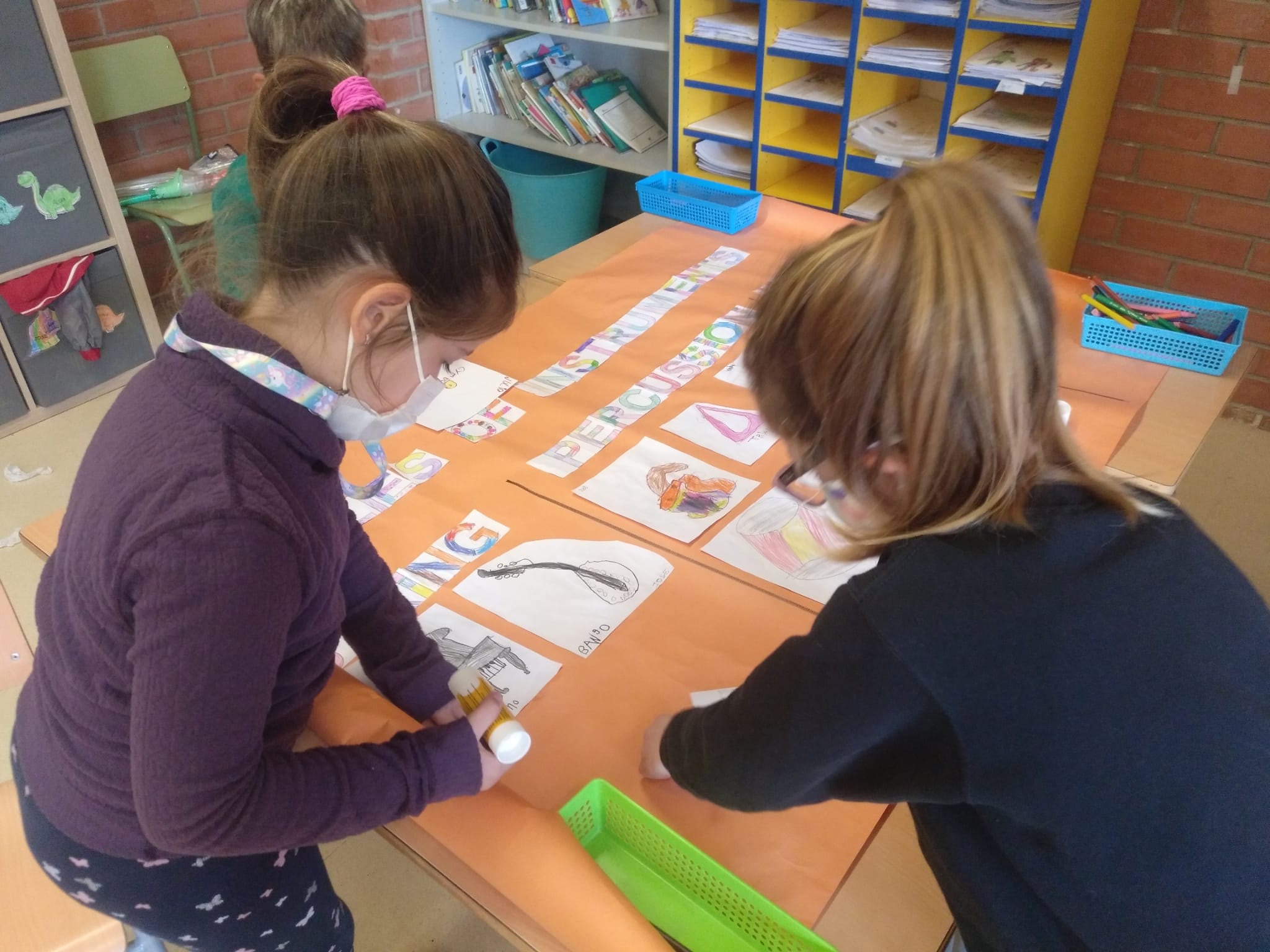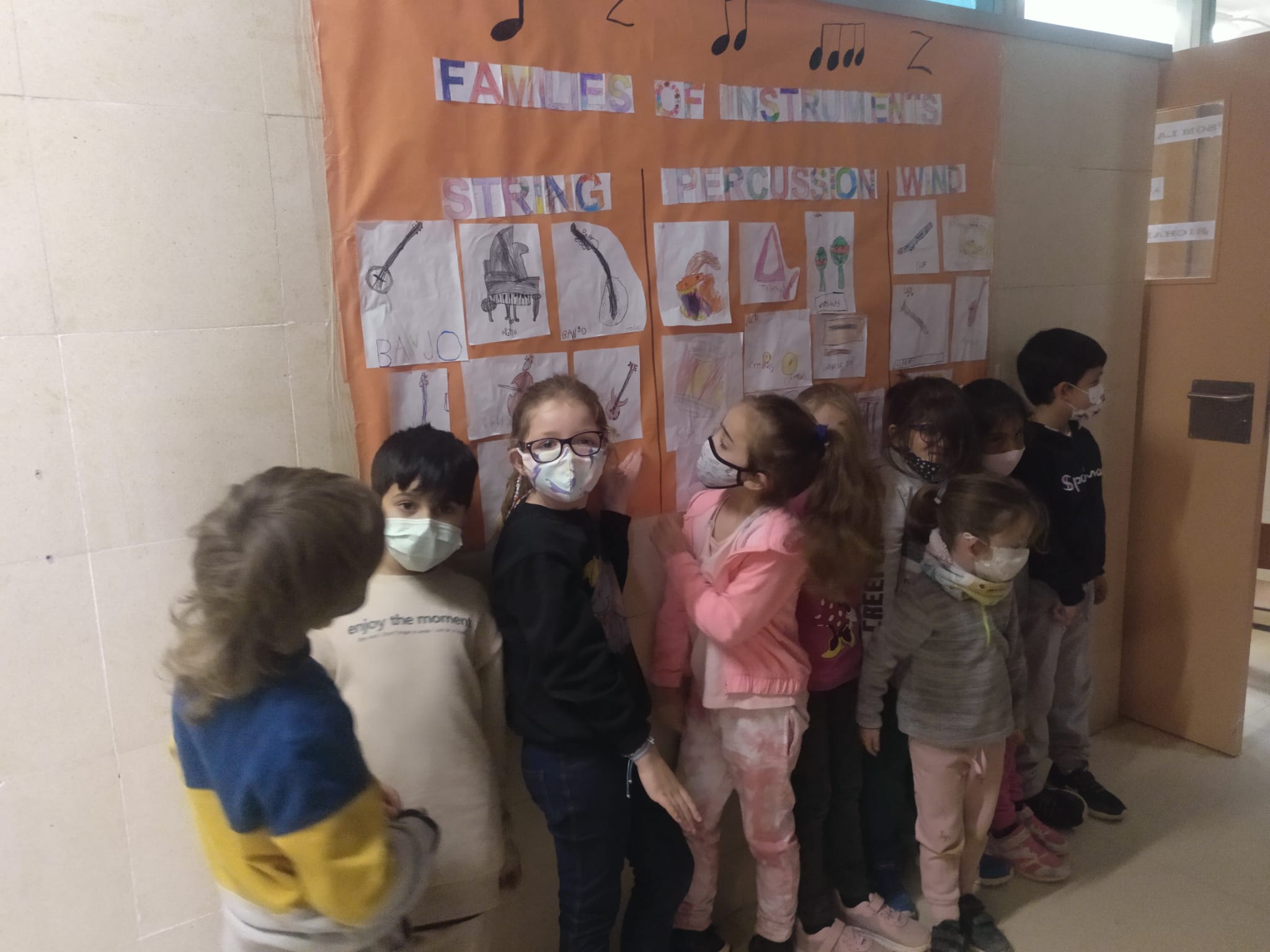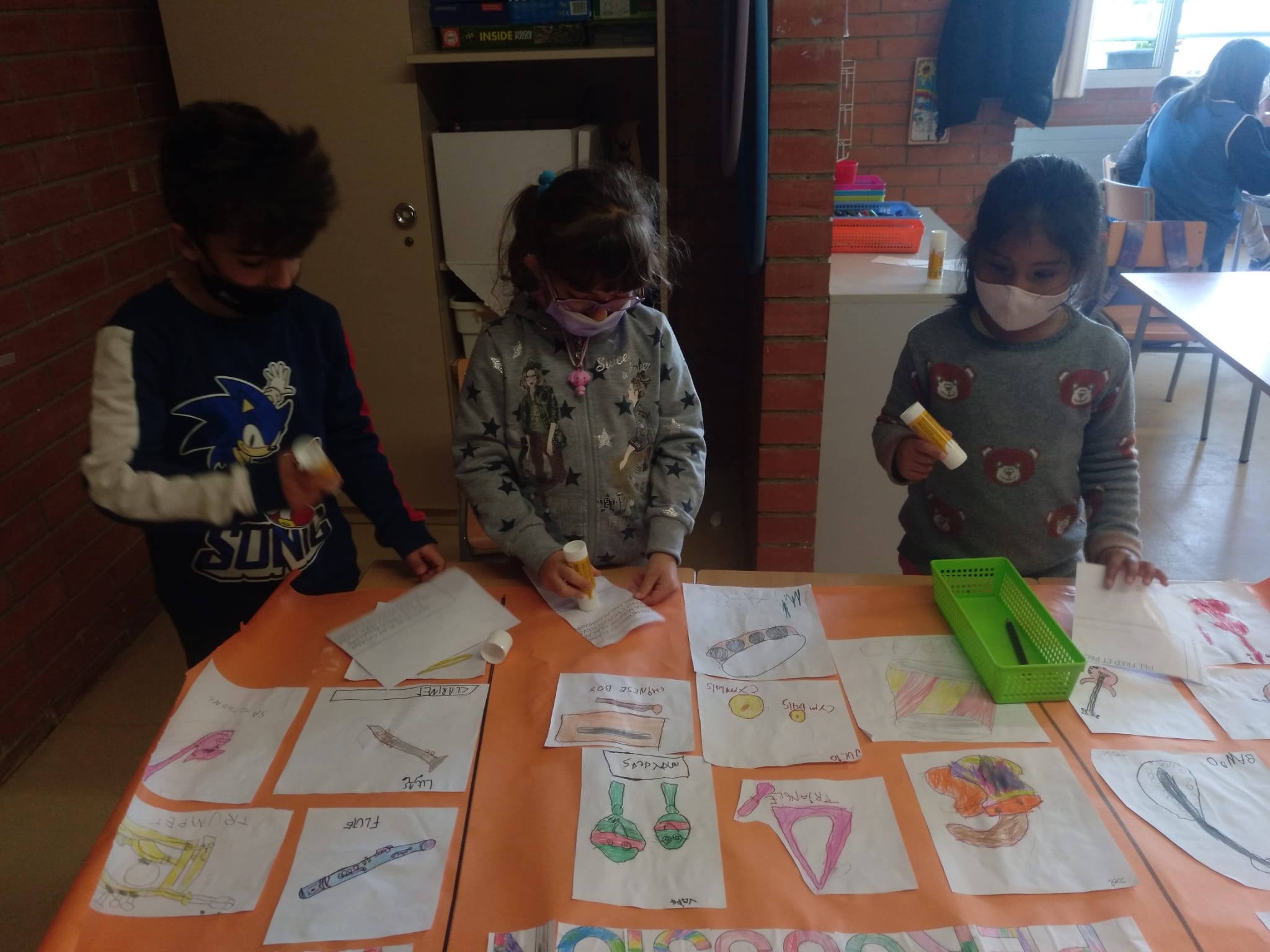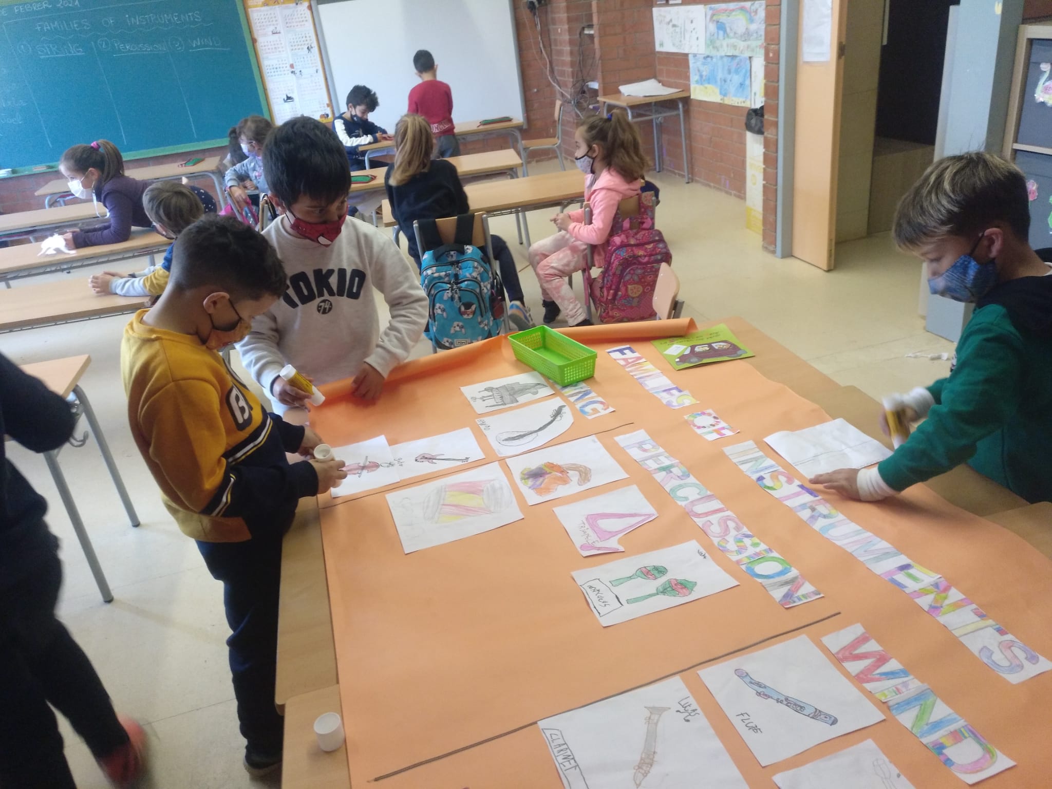 Els nens i nenes de primer després de dibuixar diferents instruments musicals els hem classificat segons la família a qui pertanyen (de vent, de percussió o de corda). Entre tots hem enganxat els nostres dibuixos i ens ha quedat un mural preciós. Aquí teniu una mostra del procés.