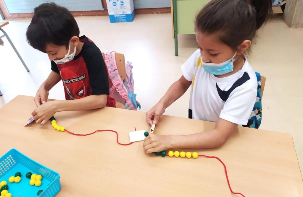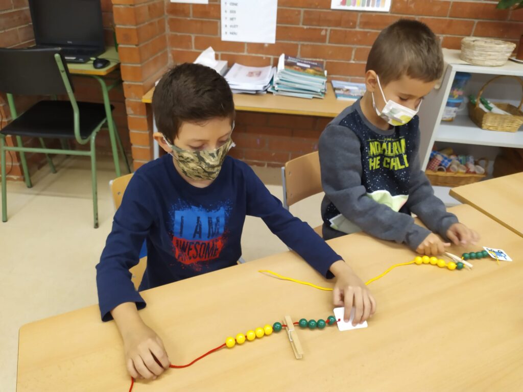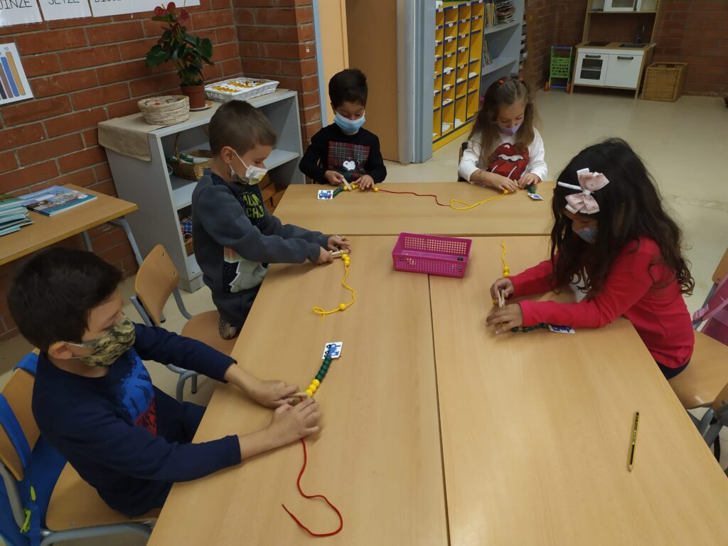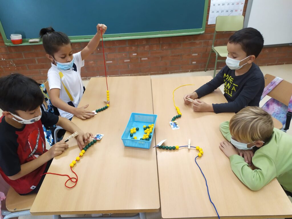 Us ensenyem aquestes sessions matemàtiques on la classe de PRIMER ha introduït el collaret de 10 boles i hem estat jugant, manipulant i formant el nostre collaret.