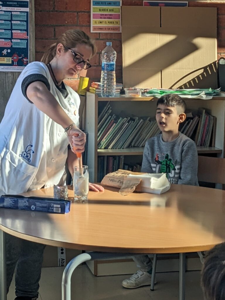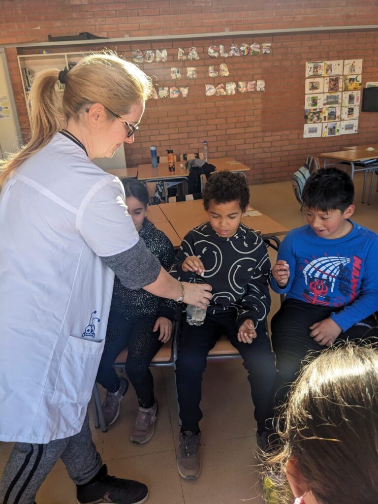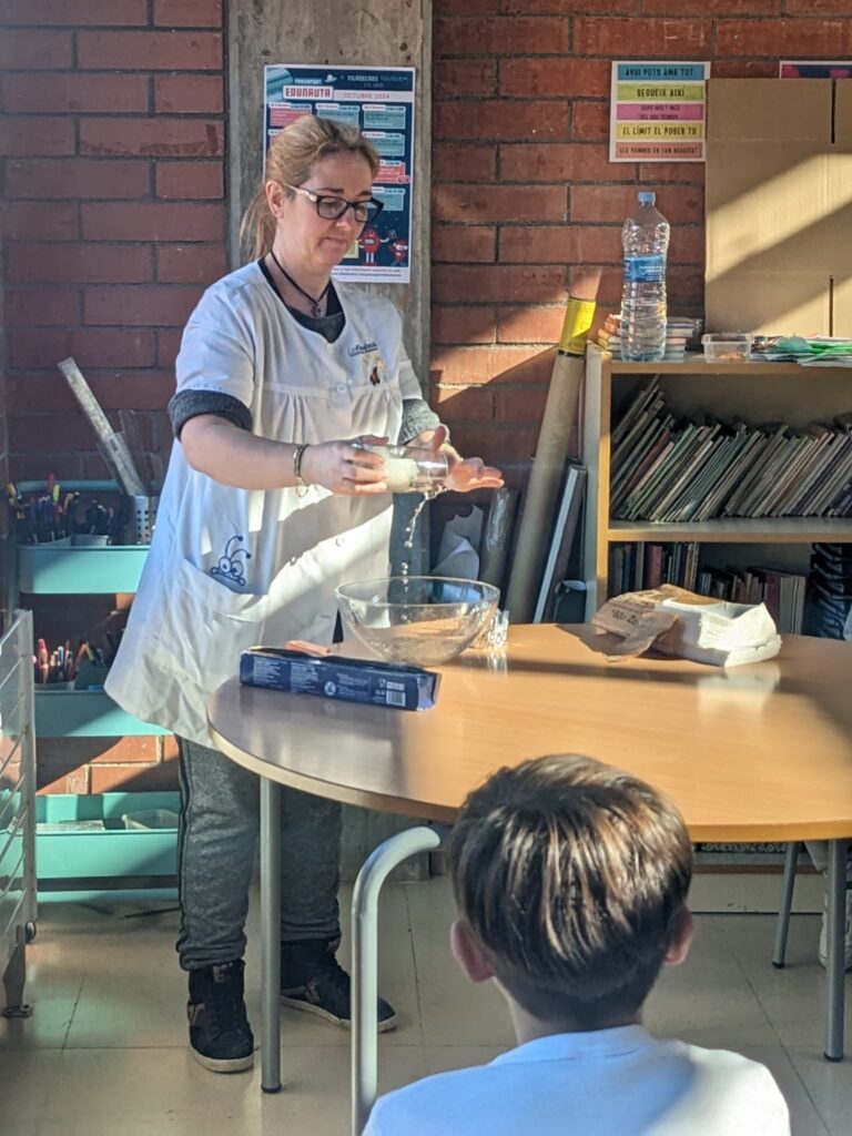 Per tal de conscienciar als infants d’aquesta problemàtica, hem preparat un taller de ciències, on els nens i les nenes han pogut experimentar sobre el cicle de l’aigua i la diferència entre la pluja normal i la pluja àcida, utilitzant una tira reactiva.