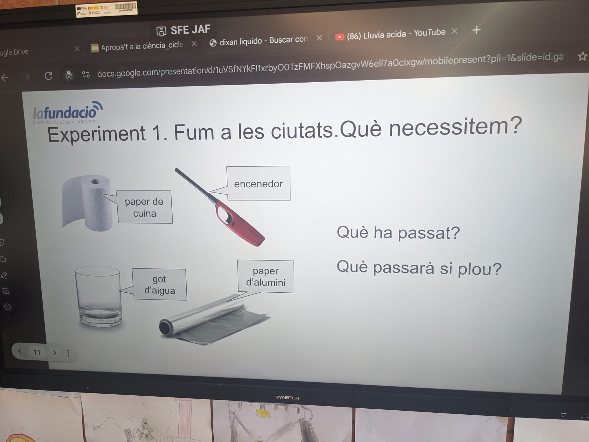 Per tal de conscienciar als infants d’aquesta problemàtica, hem preparat un taller de ciències, on els nens i les nenes han pogut experimentar sobre el cicle de l’aigua i la diferència entre la pluja normal i la pluja àcida, utilitzant una tira reactiva.