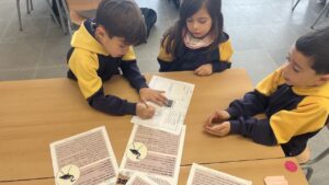 Per tancar el projecte, vam compartir el nostre decàleg amb tota la comunitat educativa a través d’un joc participatiu. Vam penjar uns cartells pel passeig dels liquidàmbars fets per nosaltres amb la màquina plòter de tall. Vam convidar les famílies i els companys i companyes a completar una butlleta amb els dibuixos relacionats amb els 10 principis.