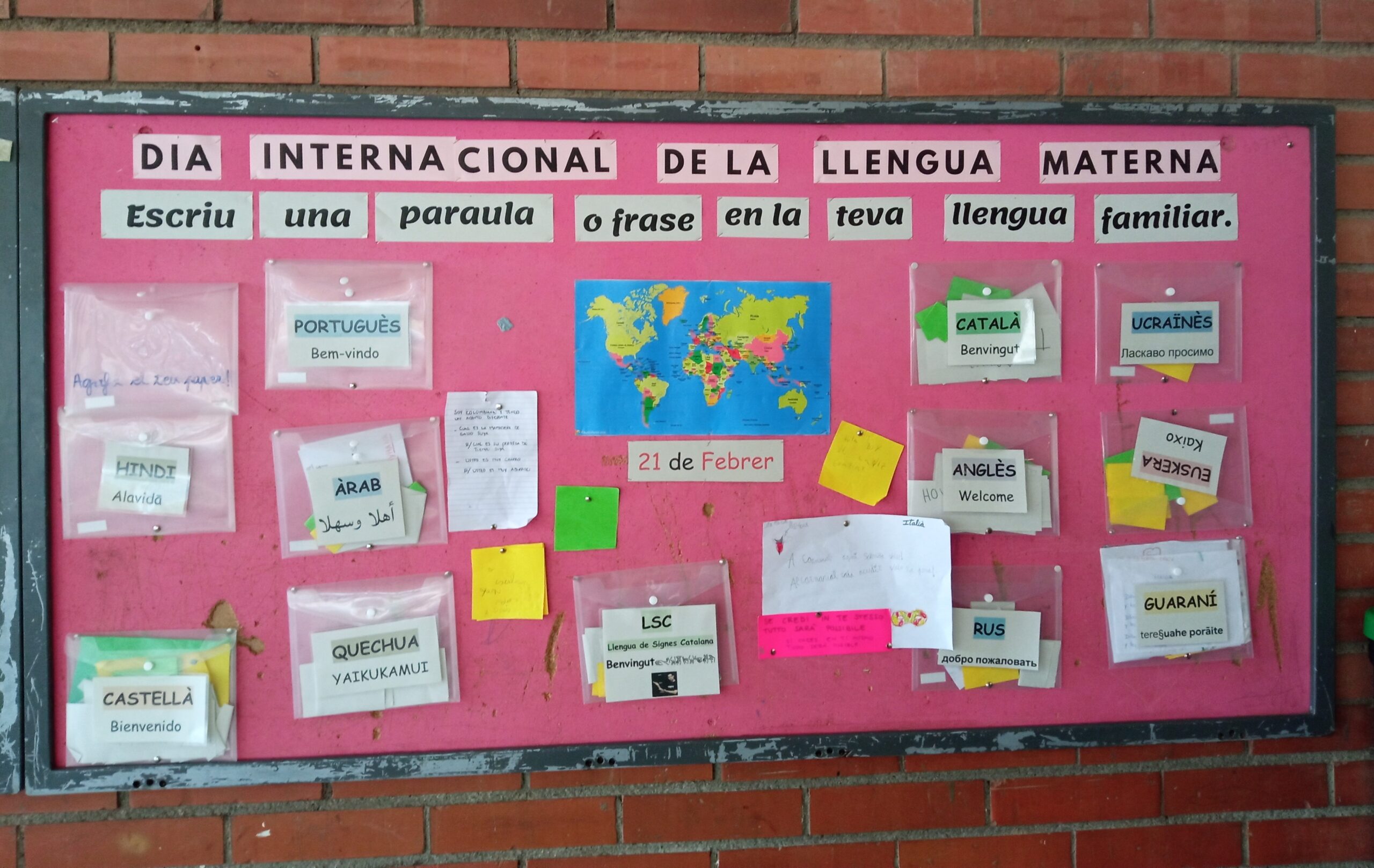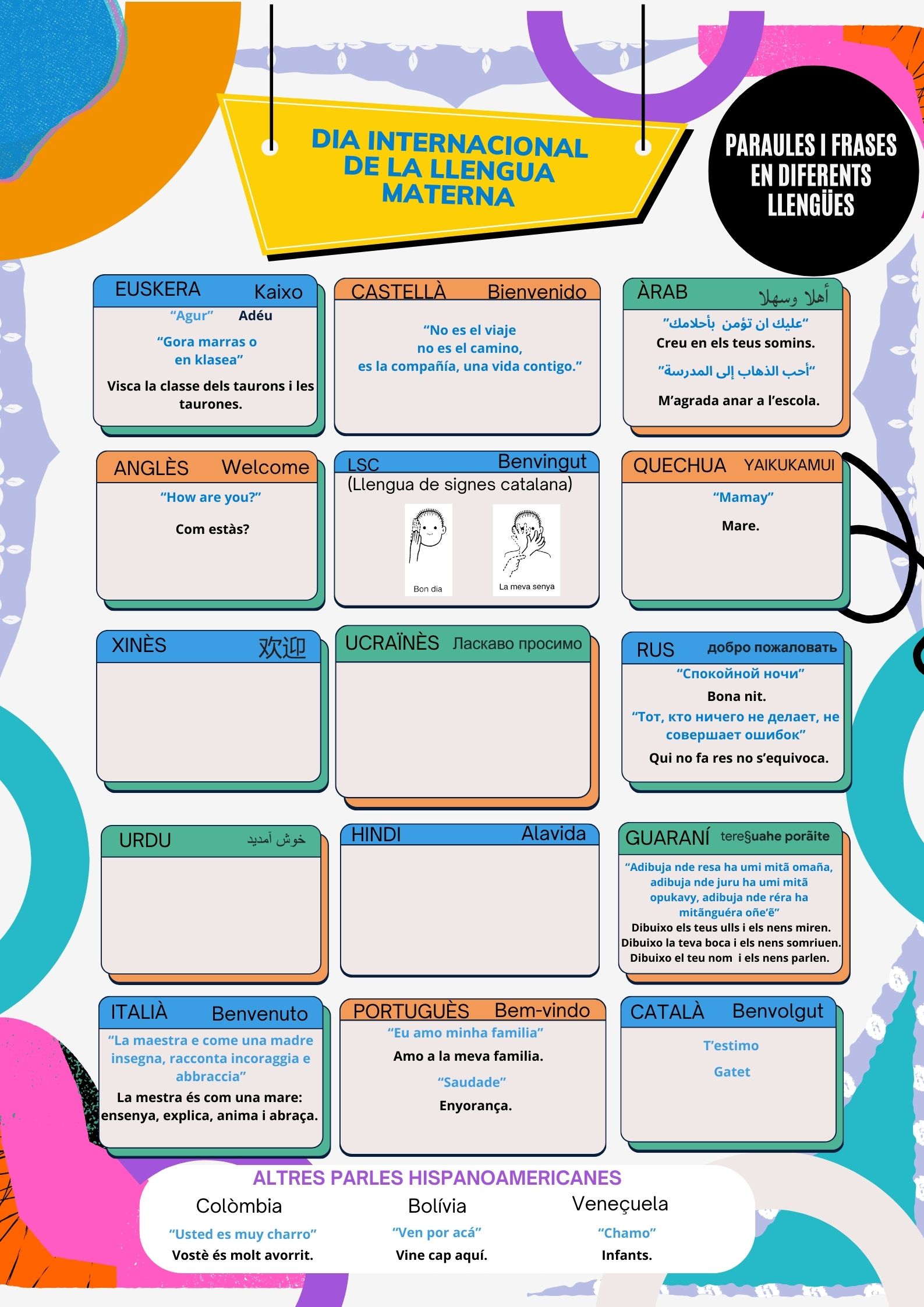Nosaltres com a centre, des dels nostres “menuts” fins als “alumnes més grans”, hem volgut retre un homenatge al plurilingüisme d’aquesta comunitat educativa que per ser la nostra té un valor molt especial. Ens complau poder aportar una petjada de la mostra que els alumnes, les famílies, els mestres i els companys ens han deixat amb paraules i boniques expressions. Són petits tresors en les llengües natives i també en algunes de les seves variants dialectals, que sense cap dubte, els seus parlants senten com a pròpies.