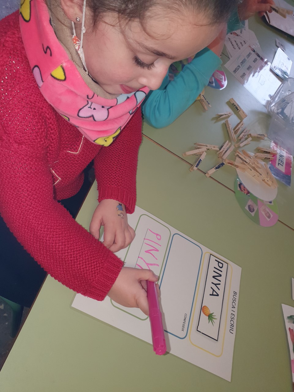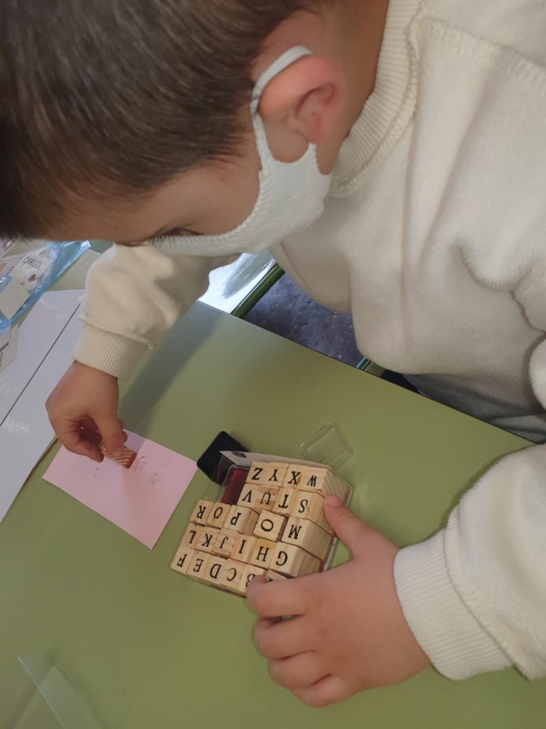 Quan fem els racons de lecto-escriptura, els pingüins i les tortugues treballem el vocabulari, la consciència fonològica i l’escriptura de paraules o síl·labes.
