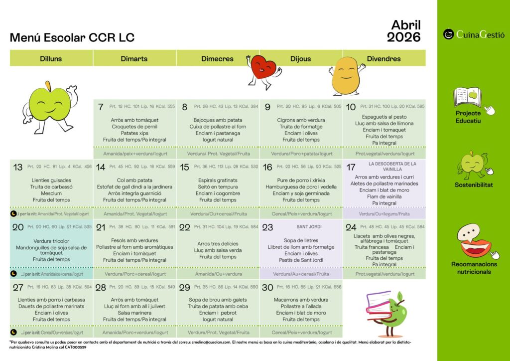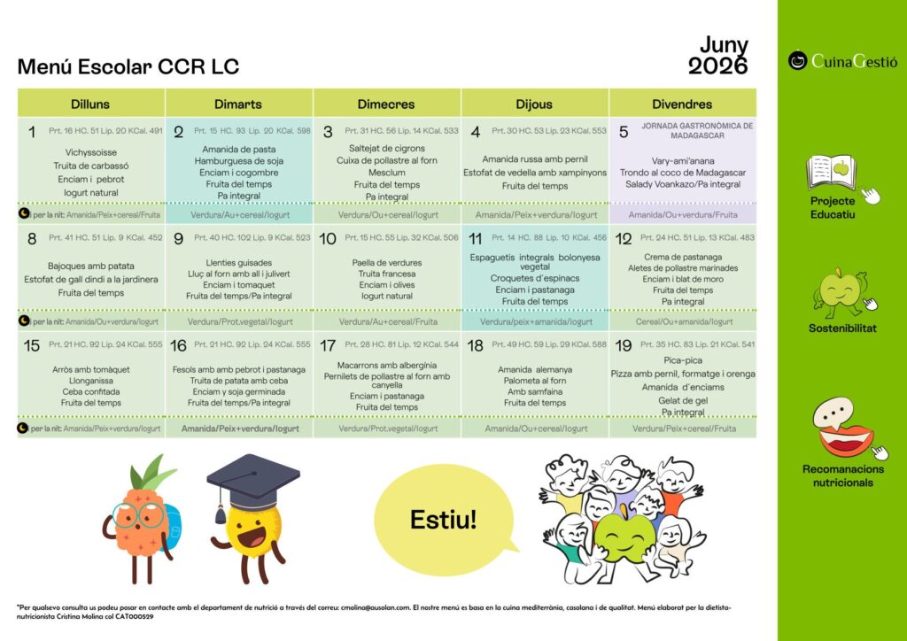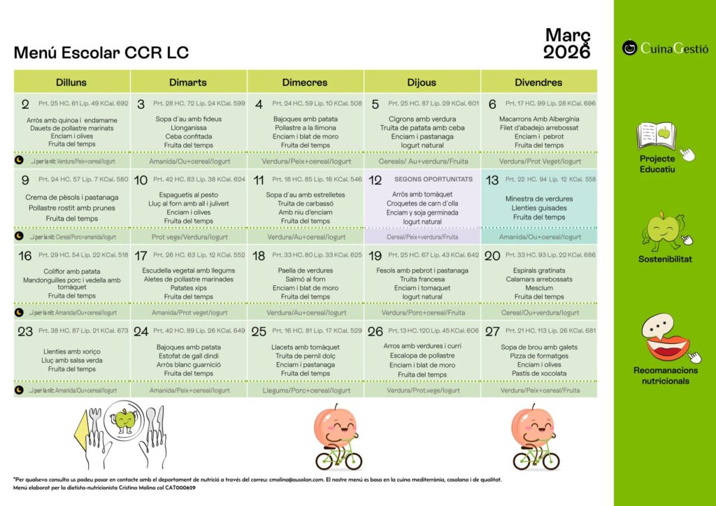 El preu del menú escolar pel curs 25-26 és de 7.54€ per dia pels alumnes fixos (que es quedin més de la meitat dels dies del mes).