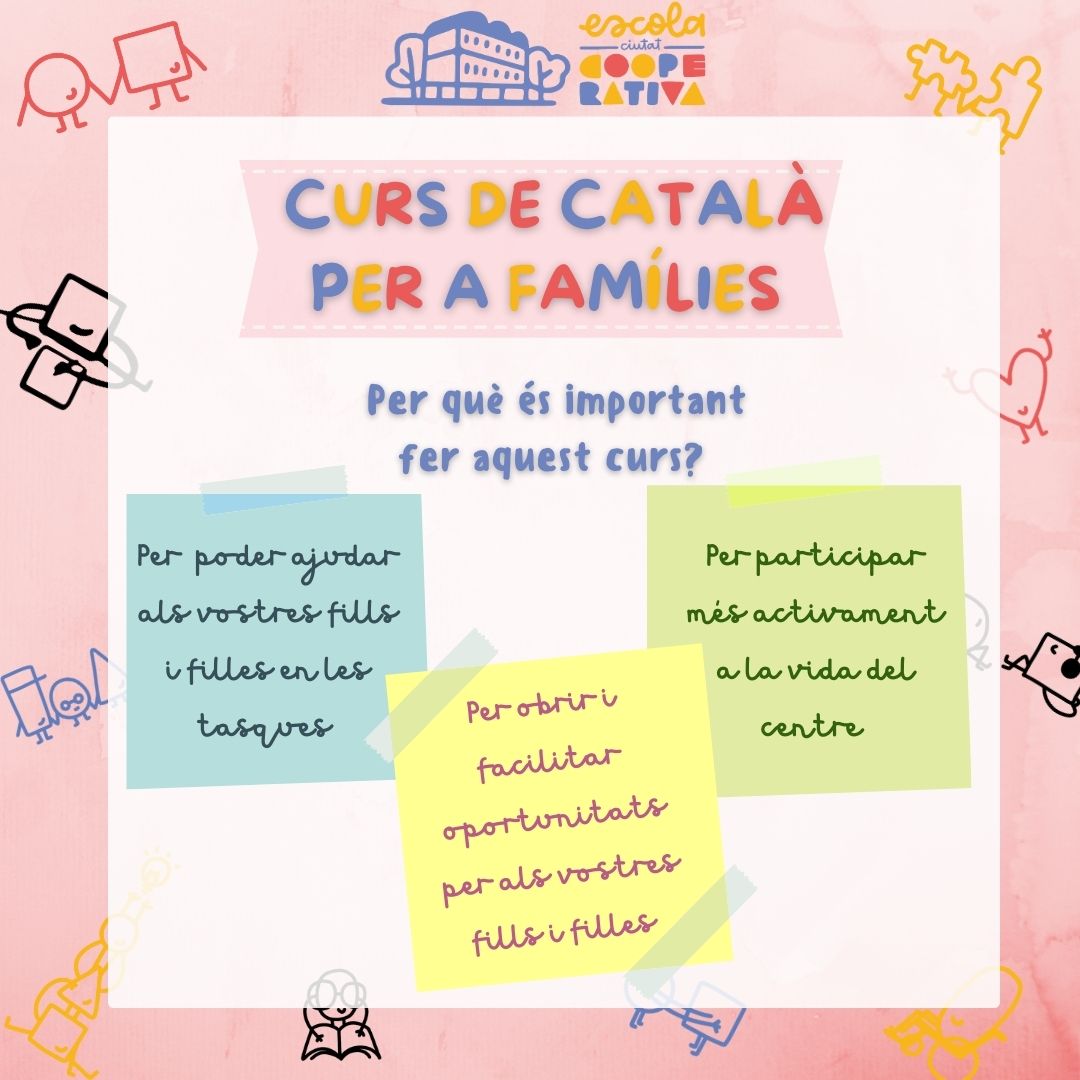 Curs Català per a les famílies! Feu un comentari / Per admin / 13 de gener de 2023 / General Portada Benvolgudes famílies, Us compartim la següent informació sobre el curs de Català que es farà a l’escola per a les famílies: Salutacions, Escola Ciutat Cooperativa