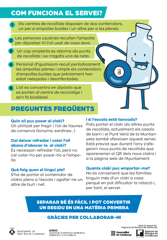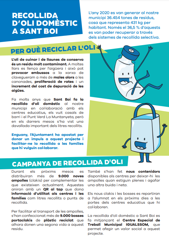 Informació sobre la recollida d’oli domèstic a Sant Boi de Llobregat Feu un comentari / Per admin / 19 de maig de 2022 / Espai AMPA General Portada Benvolgudes famílies, Us compartim informació sobre la recollida d’oli domèstic a Sant Boi de Llobregat Salutacions, Escola Ciutat Cooperativa