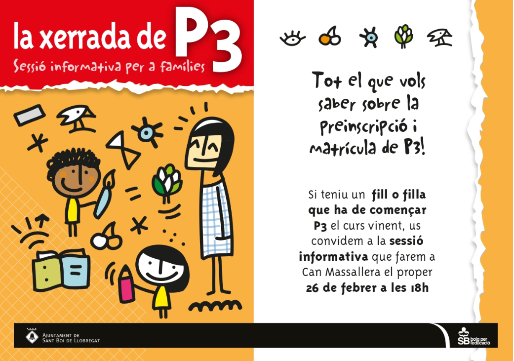 La xerrada de P3 – 26 de febrer de 2020 Feu un comentari / Per admin / 25 de febrer de 2020 / Espai AMPA General Infantil Portada Primària El proper dimecres 26 de febrer al Centre Cívic Can Massallera xerrada informativa de P3.