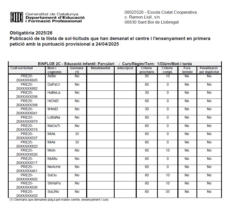 Us compartim la llista de sol·licitud que han demanat el centre i l’ensenyament en primera petició amb la puntuació provisional (24/04/2025).