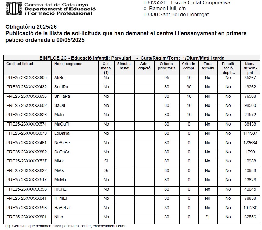 Llista de sol·licitud que han demanat el centre i l’ensenyament en primera petició ordenada Feu un comentari / Per admin / 12 de maig de 2025 / General Portada Benvolgudes famílies, Us compartim la llista de sol·licitud que han demanat el centre i l’ensenyament en primera petició ordenada (09/05/2025). Salutacions, Escola Ciutat Cooperativa