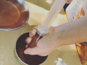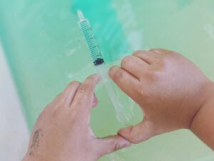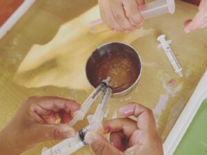 Aigua, colorant, recipients, coladors i xeringues van ser els ingredients per una llarga estona d’experimentació pels infants d’I4. 💉🫙