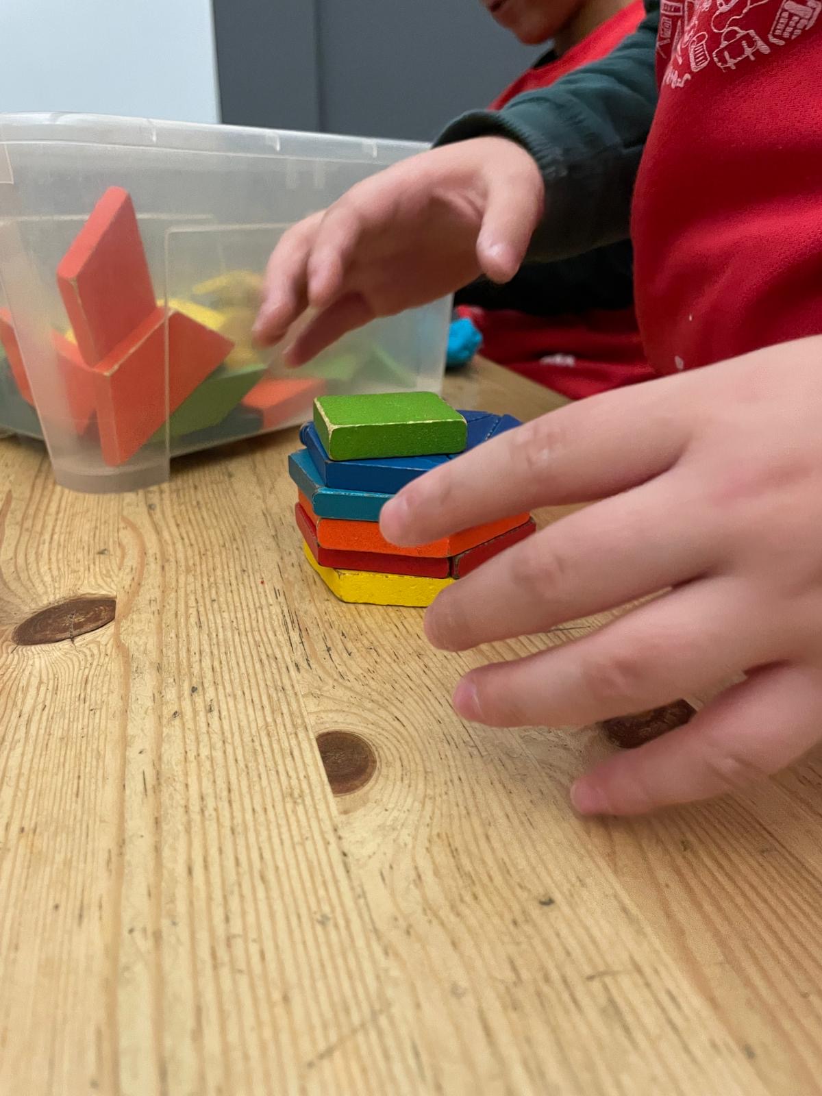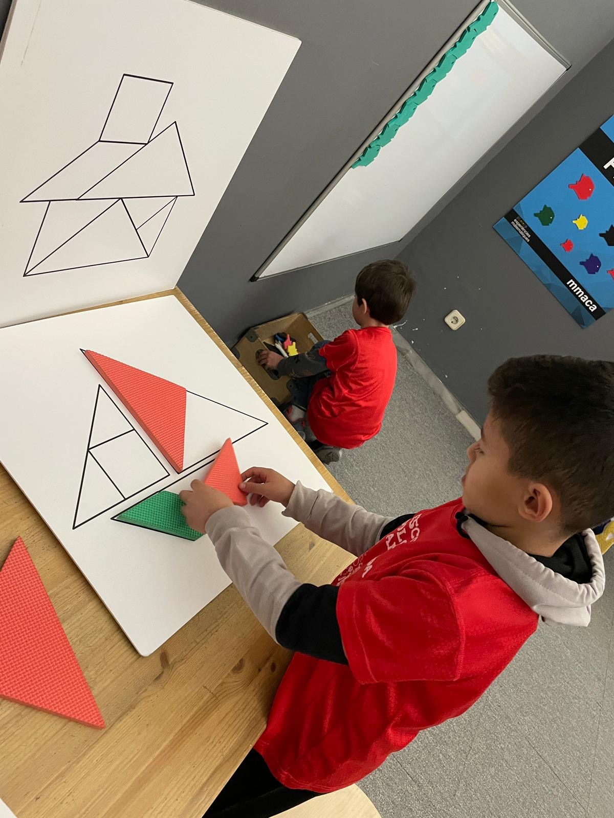 En petits grups van manipular polígons variats on van haver de combinar les diferents peces per crear-ne noves formes geomètriques, copiar i fer els patrons proposats.
