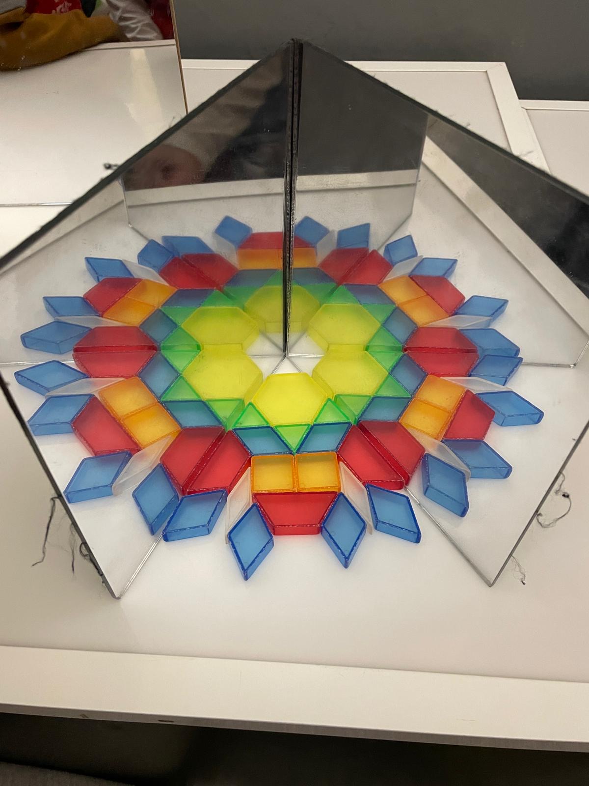 D’altra banda, tenien diferents propostes per treballar altres conceptes matemàtics: la simetria a través d’un mirall i la simetria de lletres, seguir unes pautes per aconseguir sortir d’un laberint, jocs amb gots i culleres de 3 colors que no podien coincidir en forma i color per filera ni columna, van fer construccions, un sudoku amb edificis de diferents alçades, van poder construir un cub, fer un joc de sumes amb els números d’uns daus, reproduir patrons i sèries amb figures.