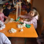 Els infants de P5 i segon han començat el dia descobrint els orígens de la llana, la seva textura, els tints naturals i tot el procés artesà que aquest ha de seguir per tal de poder-se transformar en teixit. Els infants han après també a utilitzar les eines bàsiques per a treballar la llana “el fus, el cardot, el teler i l’agulla”. Després han fet de cuiners, descobrint el procés d’elaboració de les galetes de mantega en forma de cor, estrella, lluna, núvol o flor, així com l’origen dels seus ingredients.