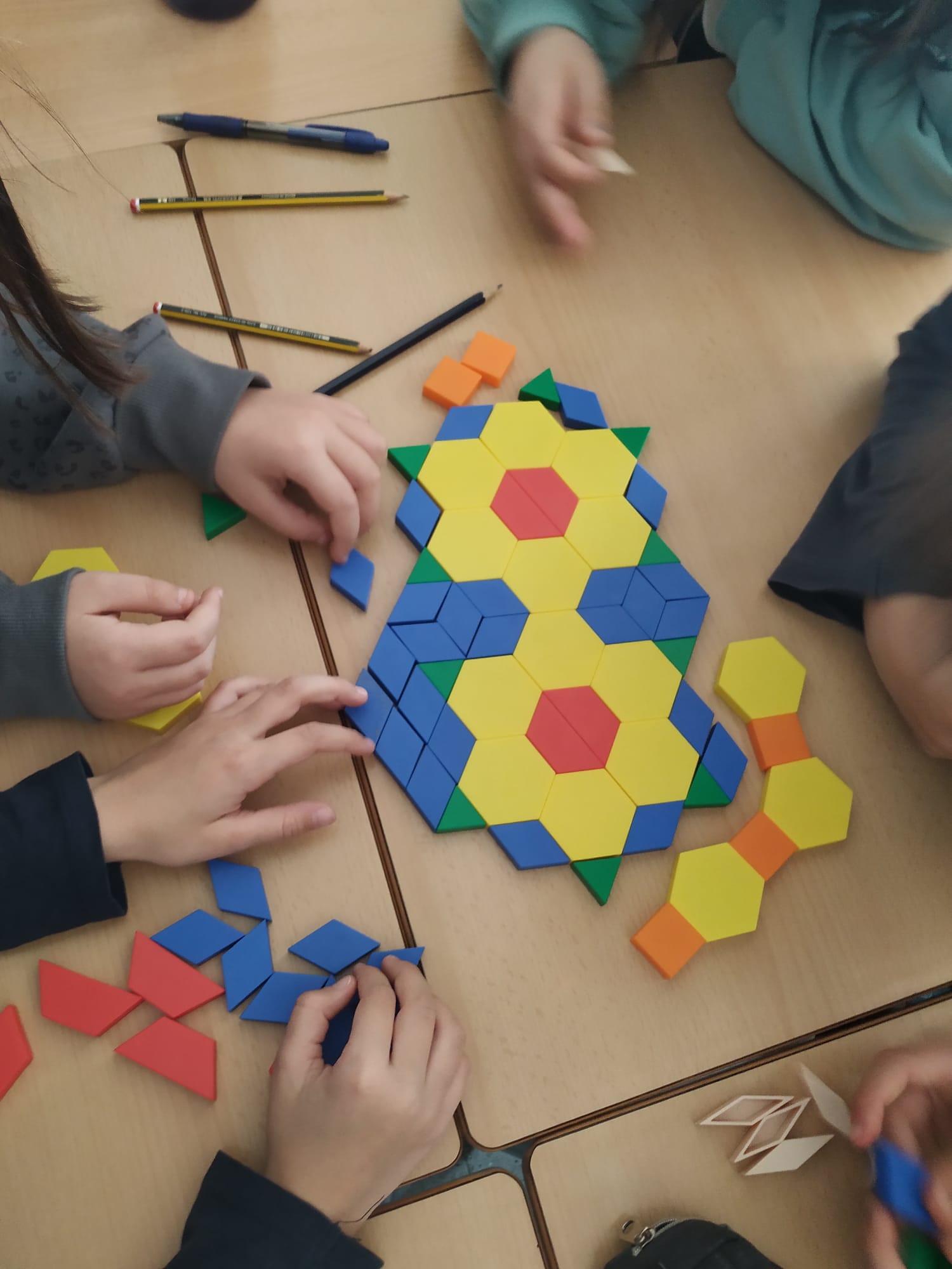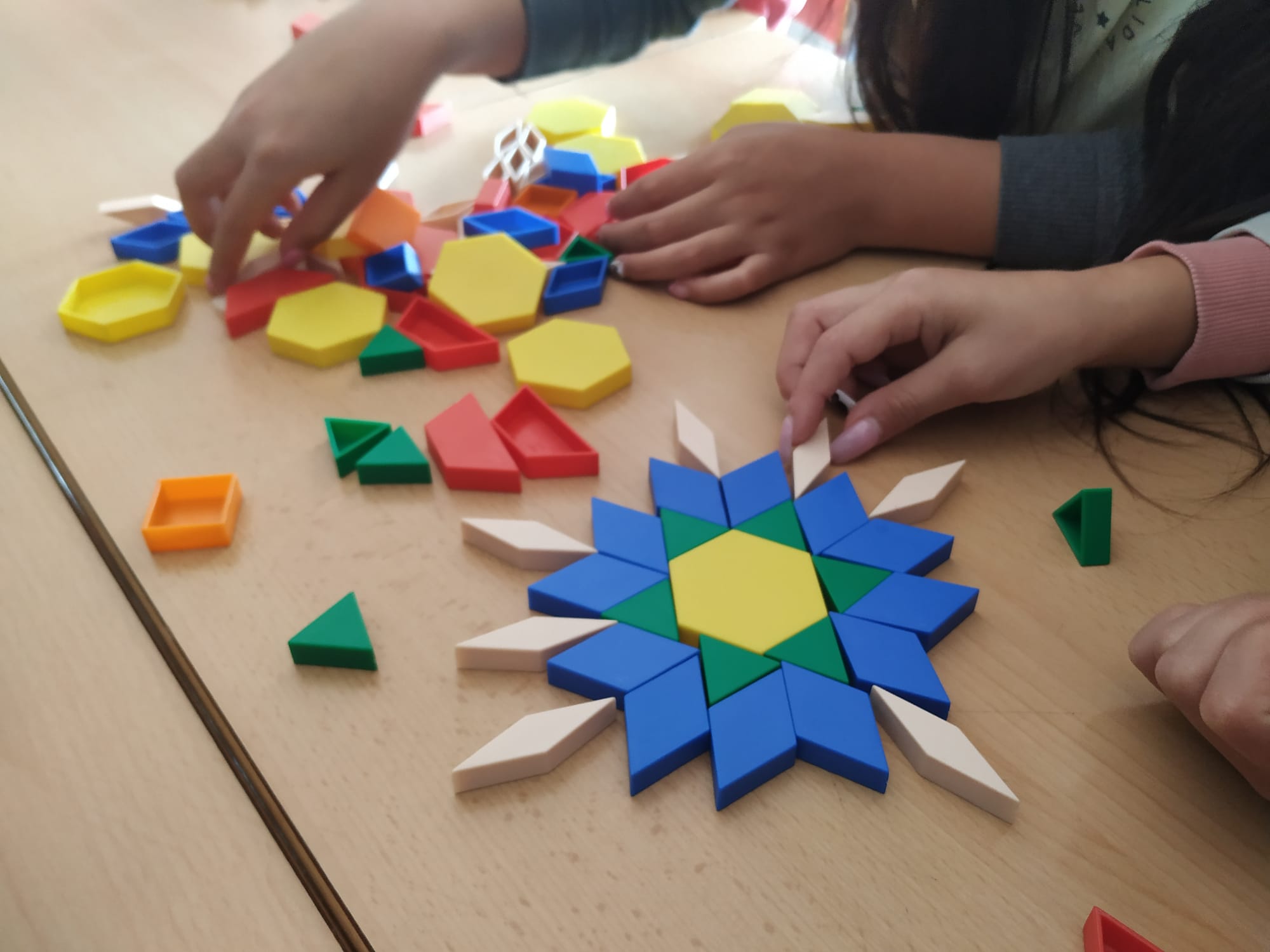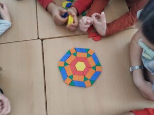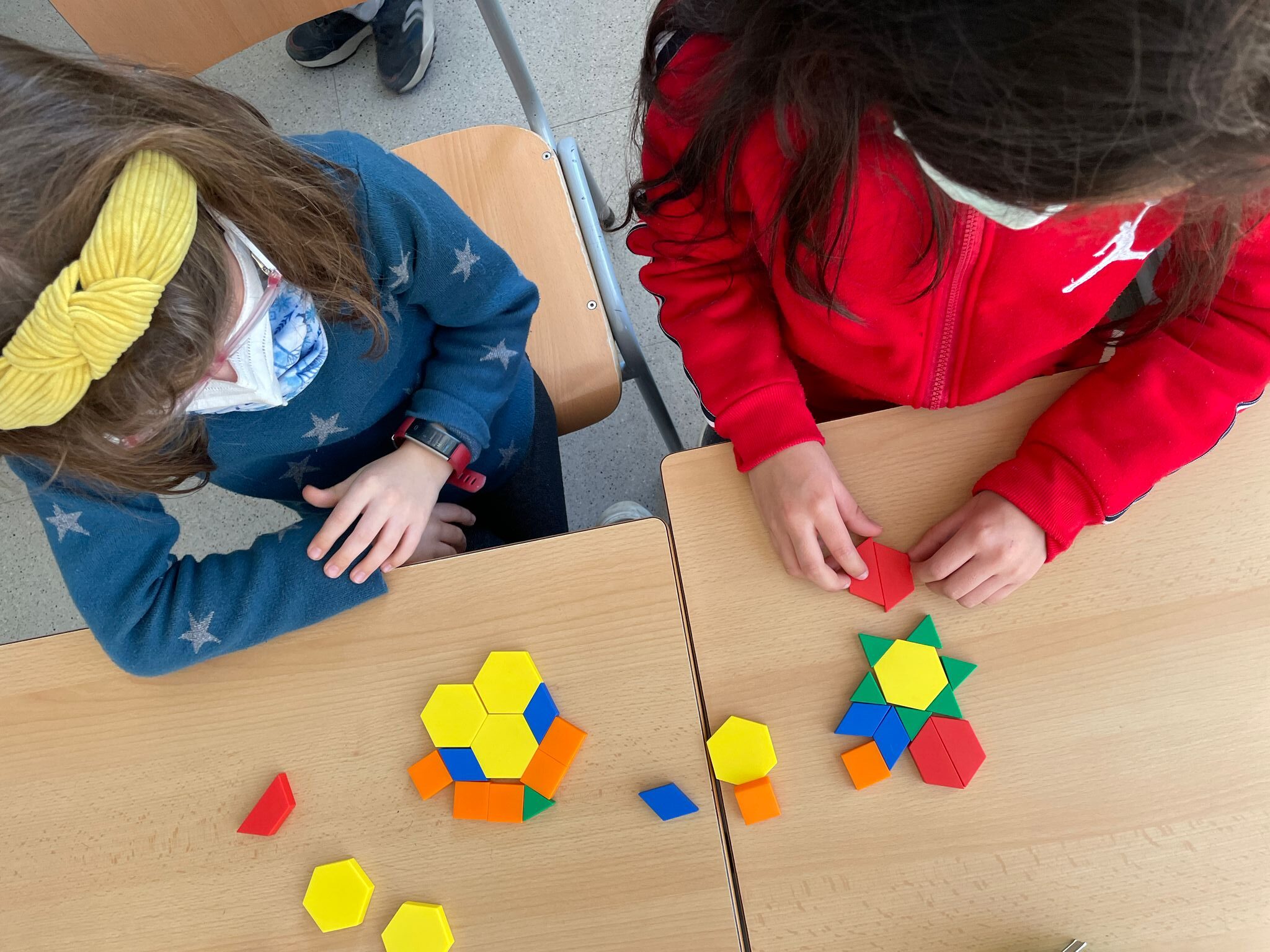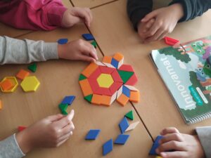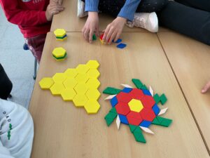 Sense mirar i només tocant la peça, anaven endevinant quin polígon era a través de preguntes com “Té 4 costats?” “Té 3 vèrtexs?” i només responent “Sí” o “No”. Després, van començar a crear mosaics combinant els colors i les formes amb totes les peces que tenien.